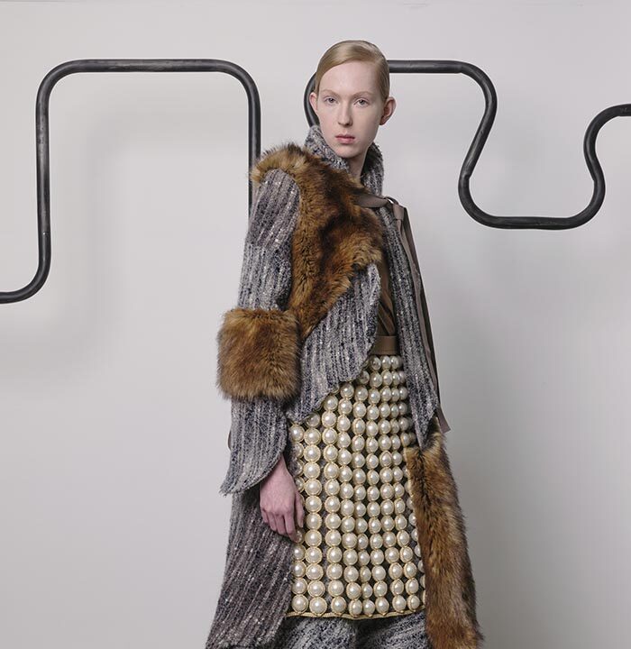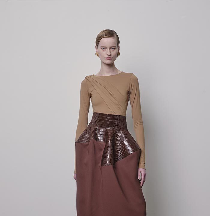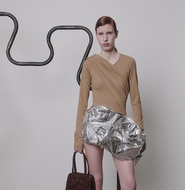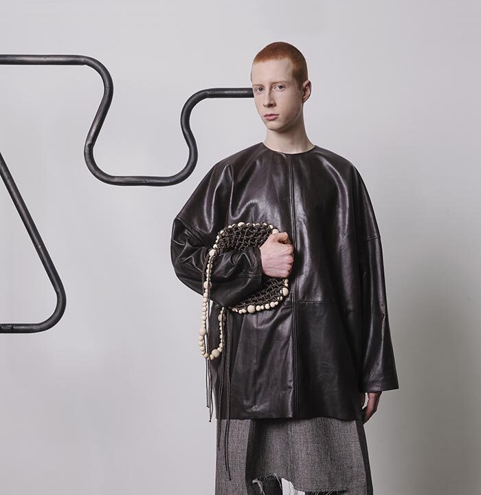 Things that before were indestructible, immovable, will begin to yield, becoming malleable. Sheets of rigid metal will collapse into themselves like so many crumpled sheets of paper. Worn sparsely as jewellery – a brooch to secure a scarf, a pair of earrings, a cuff over the sleeve – or even as clothing, the shiny warped surface reflects and distorts its surroundings. In the distorted reflection, you see wooden pearls assembled into a kind of armour, and leather which looks like crocodile skin forming a kind of pannier. These things, which once seemed so heavy, will only become lighter and lighter with time.