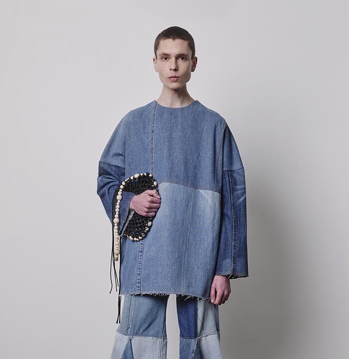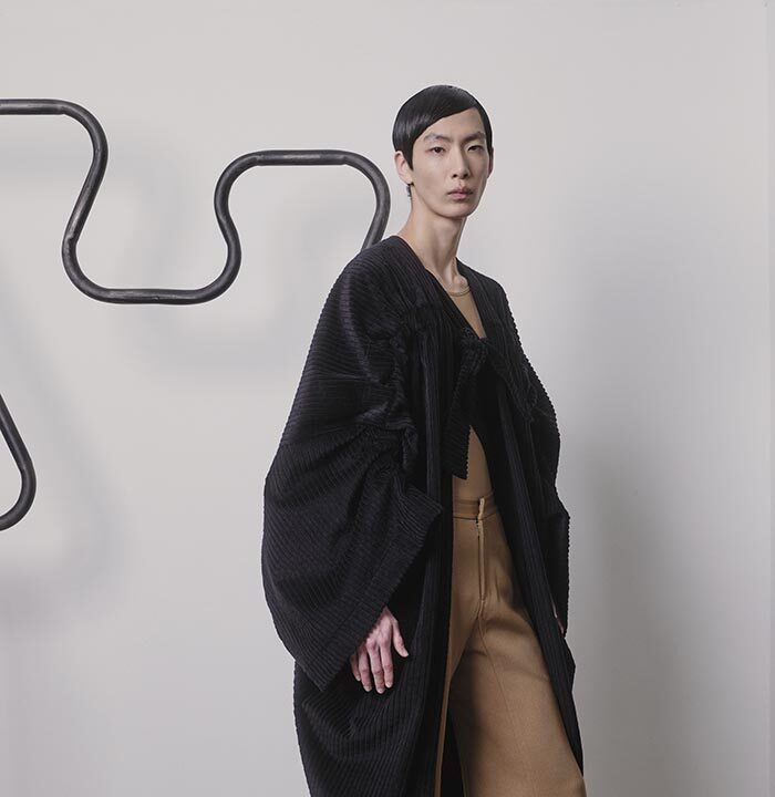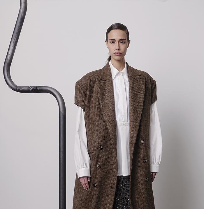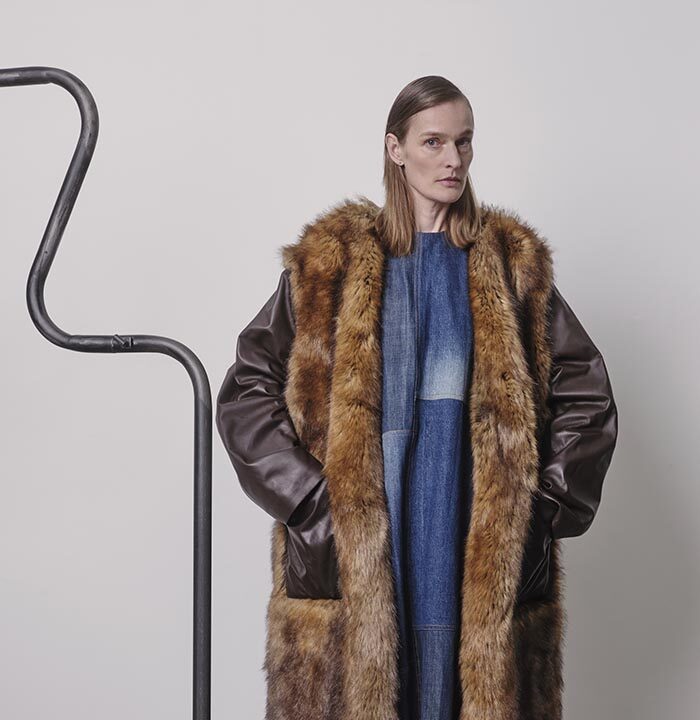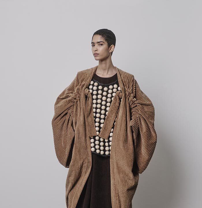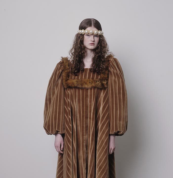 Impressions and belongings, collected in memories and in once empty rooms: countless things waiting in the dark to be remembered and cherished again. Riffling through the wardrobe, stuffed with old clothes, the textures you encounter sweep you away from the present. The tweed of a jacket slightly damp from the rain, denim from pairs of jeans in all different washes, scraps from a faux fur coat, a classic tweed blazer starting to fray. When you find your father’s corduroy jacket, you imagine what it would look like if it were a dress. How would it move, how would it appear from afar, would it still remind you of him? Robust enough to be worn over and over again, the wide ribs of cord are yet so soft that they change with the slightest touch. You caress it back and forth to see what imprints it leaves.