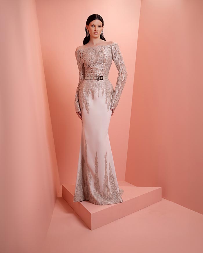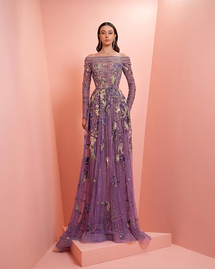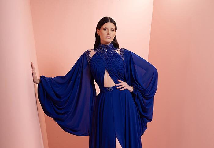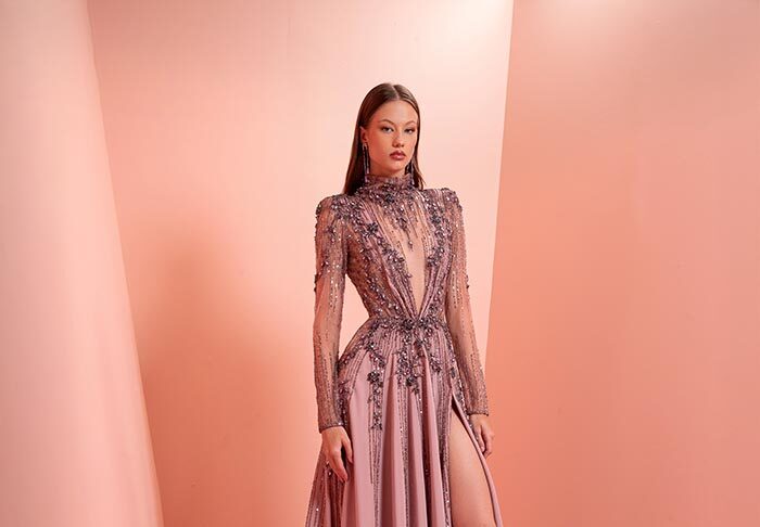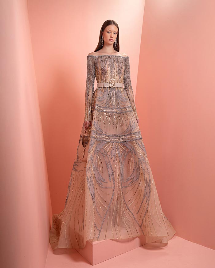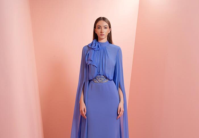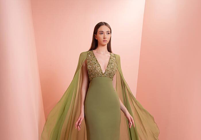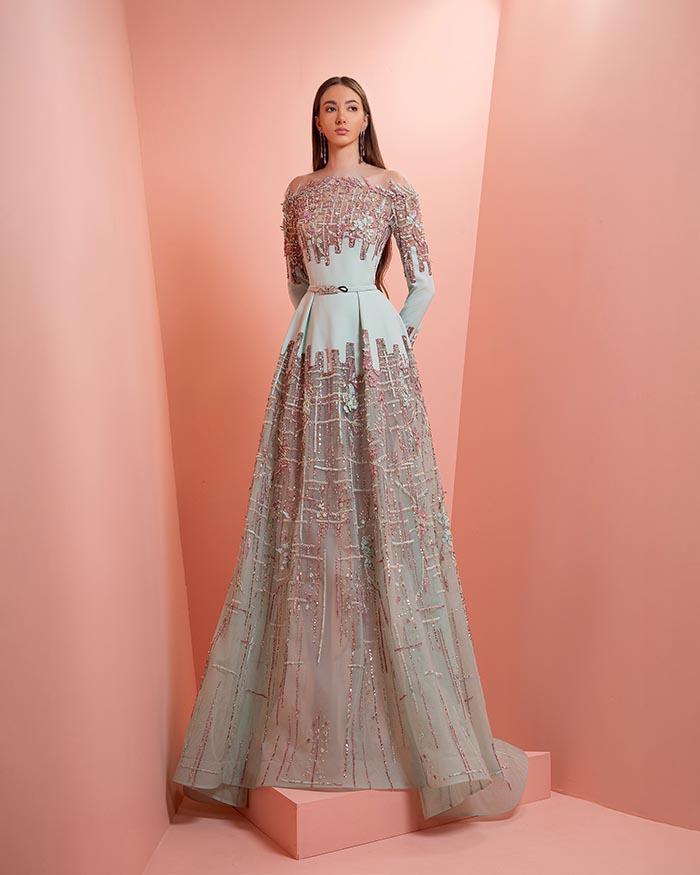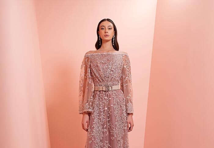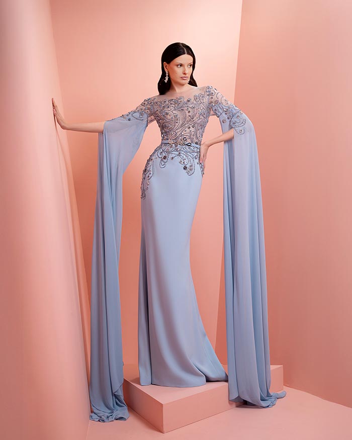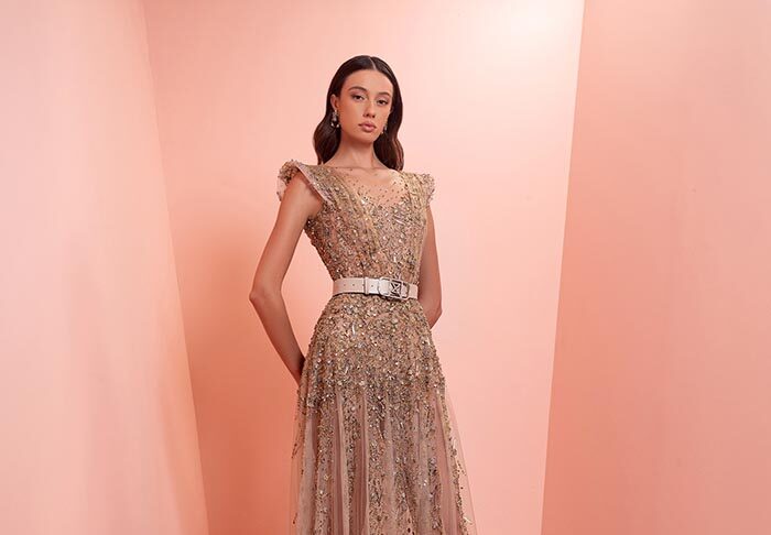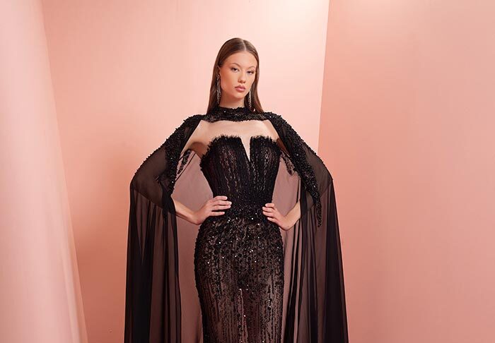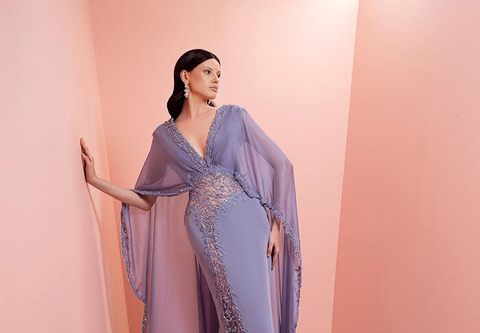 “Nuance” is a meditation on gradations. In color, it explores transitions from soft to bold, sometimes within a single garment, where hues merge in a living dialogue. In fabric, it dances between the delicacy of crepe, chiffon, tulle, and lace, to the ethereal flutter of feathers and the sparkle of embellishment. Each piece unfolds a different mood, offering women a spectrum of choices for different moments of life.
