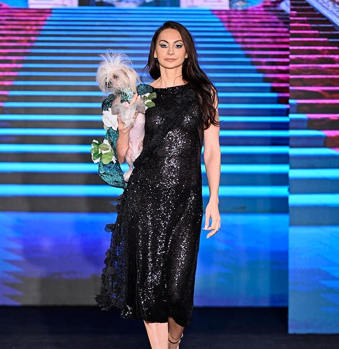 My creations for the humans were done utilizing the colors of red, black and gold purposely done to allow the Canine Couture to pop. There were lace dresses featuring rose embroidery, some with rose chiffon rose petals and lots of sequins to bring on the glitter and glam.