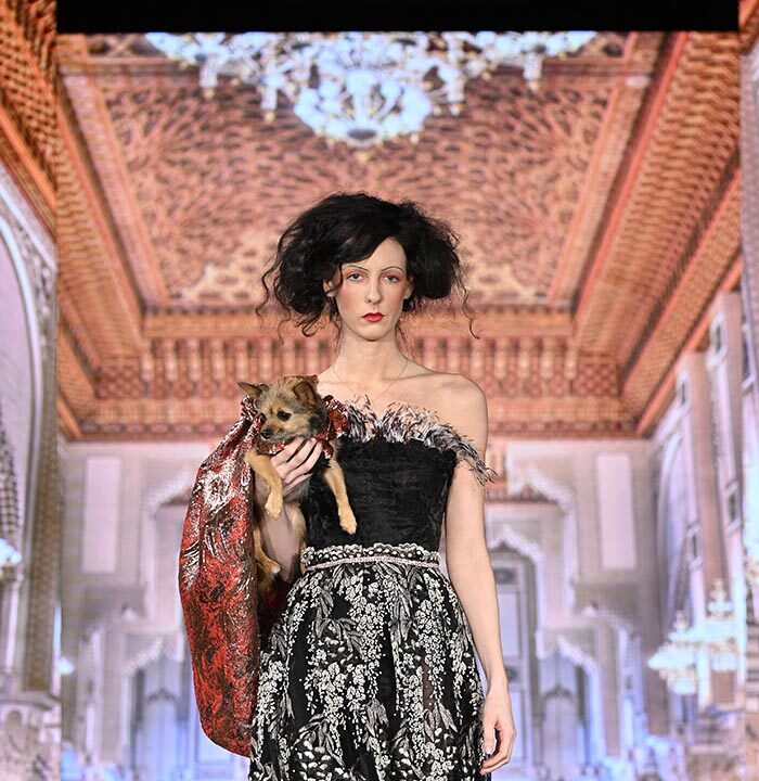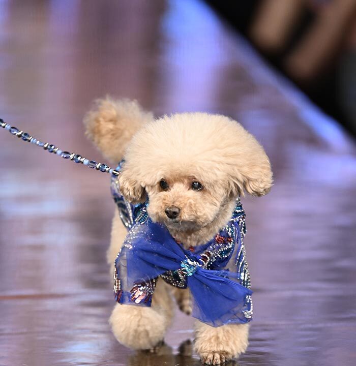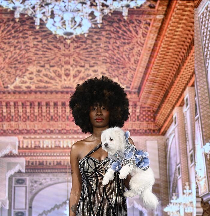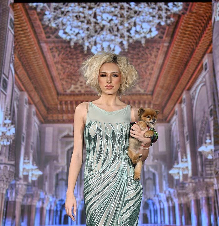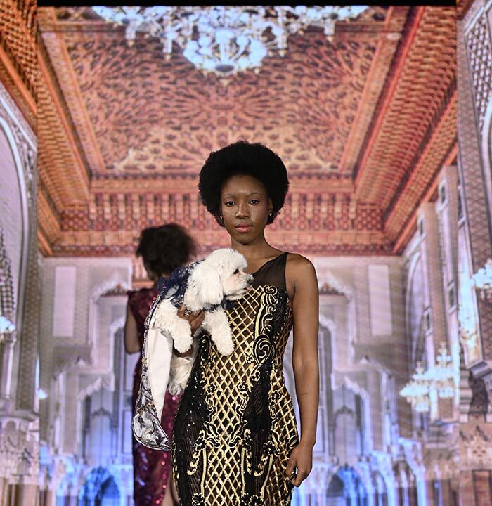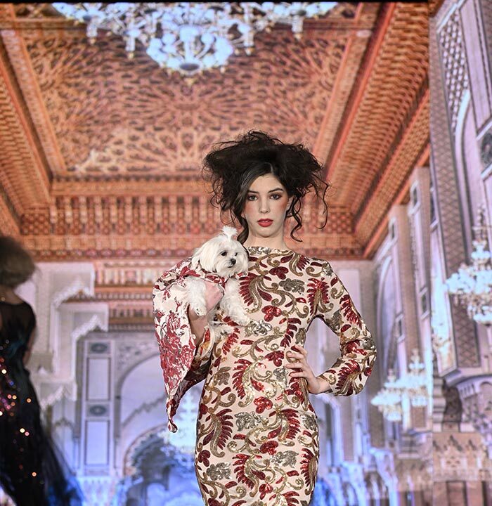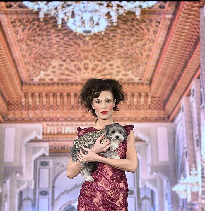 For this show I brought back the glitz and glam as inspired by old Hollywood but with a few modern twists and the same applies to our four legged friend both canine and feline. I chose lovely metallics, sequins, and bead work on comfortable stretchy fabrics, some with sheer netting to hug the curves.