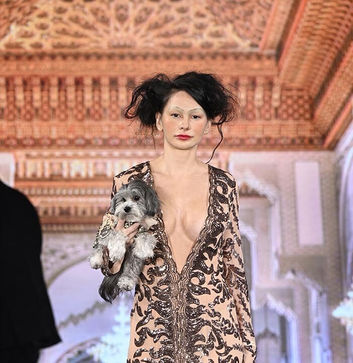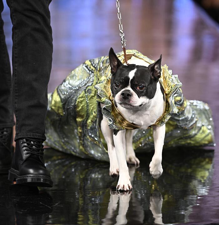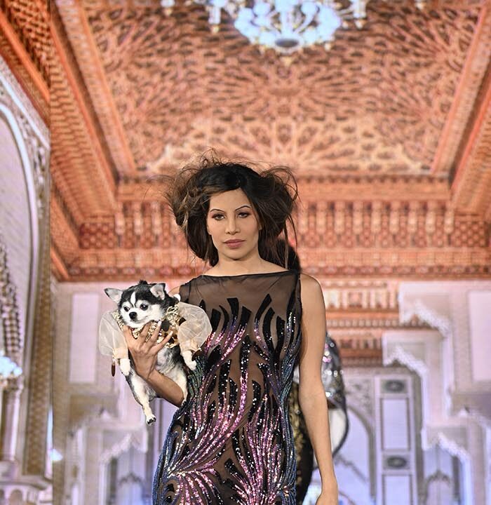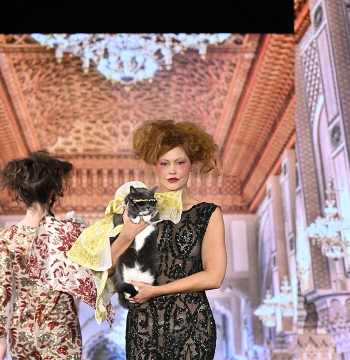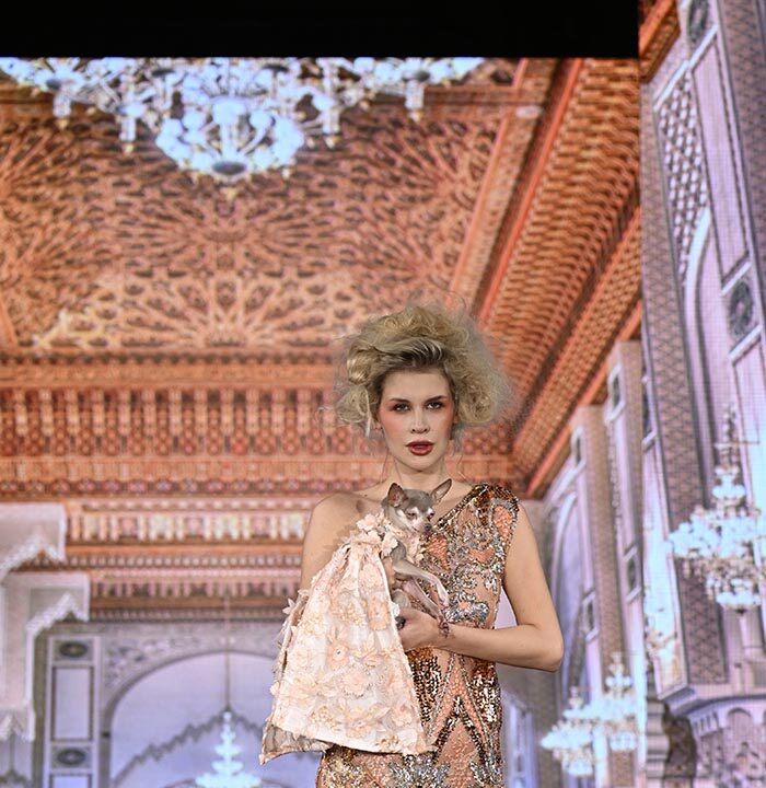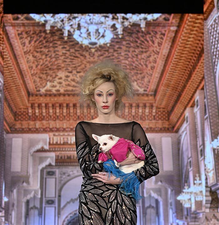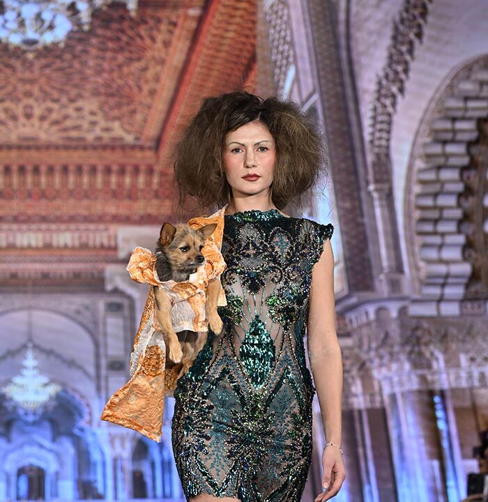 For this show I brought back the glitz and glam as inspired by old Hollywood but with a few modern twists and the same applies to our four legged friend both canine and feline. I chose lovely metallics, sequins, and bead work on comfortable stretchy fabrics, some with sheer netting to hug the curves.