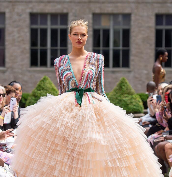 This season’s collection celebrates the diversity of women’s beauty, showcasing a range of volumized silhouettes, a meticulously curated color palette– from Apricot Crush to Midnight Plum and Avatar Aqua, and intricately crafted appliqués, including beautifully articulated Sequins, Shiny Tulle and Embossed Jacquard to portray her own elegant medley of classic romance and contemporary edge. This season’s collection is set to be a captivating display of artistry.