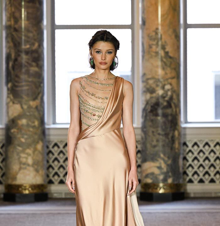 Signature liquid organzas, intricate 3D embroidery, and architectural constructions define the collection’s craftsmanship. One opening gown is encrusted with thousands of crystal beads, demanding over 500 hours of embroidery. Another shimmers with an all-over constellation of bugle beads, crossing in radiant directions. Through these techniques, weightless illusion is balanced with rigorous structure, reflecting KWON’s devotion to artistry and storytelling.