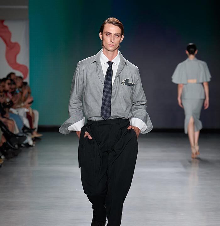 Designer Leo Hsiung brings a bold collision of culture, identity, and imagination to the runway. Blurring the lines between fashion, graphic design, and narrative, Hsiung invites us into a world where child-like wonder meets refined design and cultural curiosity.