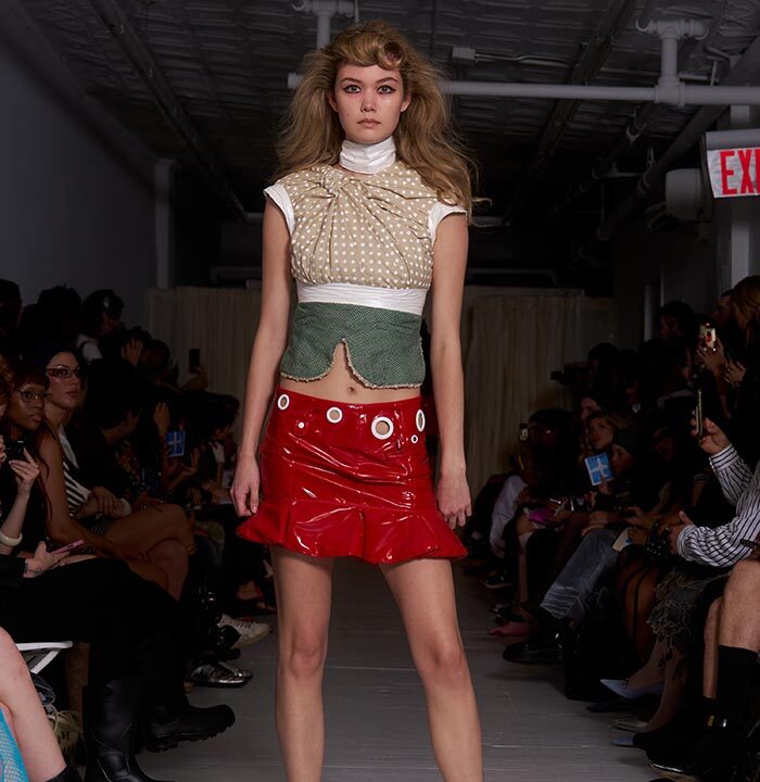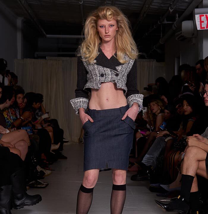 With fashion roots stretching back to childhood sketchbooks, Skylar channeled 1980s Manhattan streetwear in her debut collection Jungle Fever. Leopard prints, vibrant reds, and faux-fur details met with bold, graphic silhouettes. Standout looks ranged from a red double-breasted pantsuit paired with a leopard tee, to a leopard catsuit, to a dramatic black turtleneck dress styled with a red faux-coyote coat.