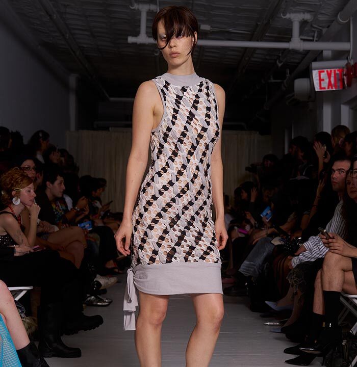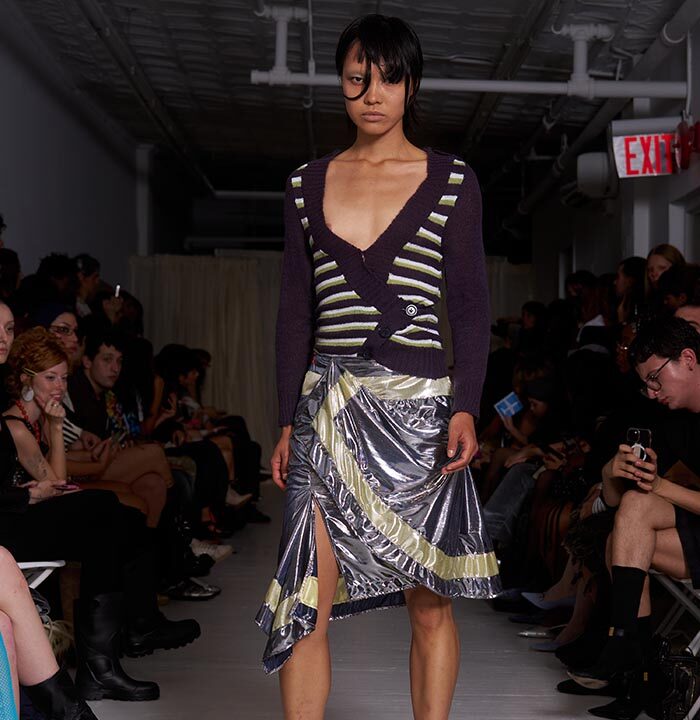 Brooklyn-based designer Gabe Gordon’s eponymous label—worn by cultural icons like Kim Kardashian and Dua Lipa—rose to prominence in 2021 with the launch of his asymmetrical Vortex cardigans, establishing the brand as a fixture in the experimental fashion scene in New York and beyond. In the past two collections, the label has entered a new chapter under the creative partnership of Gabe and his husband, Timothy Gibbons, whose background in costume design, tailoring, and construction has brought a refined structural depth to the brand’s vision. Gordon and Gibbons blend their expertise in knitwear, tailoring, and textiles to craft a distinctive brand that is grounded in sustainability, object connection, and the deconstruction of the false boundaries and embodied potentials of identity. Their work reflects a commitment to craftsmanship and a deep reverence for fashion and costume history.