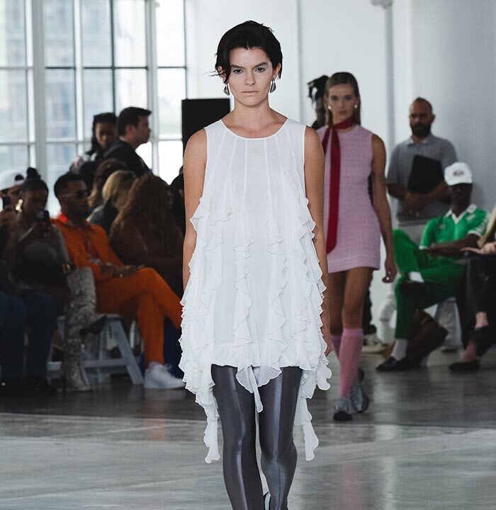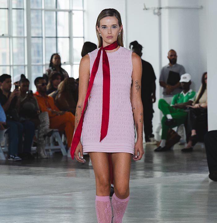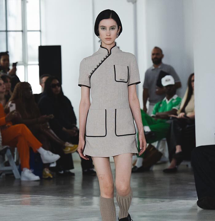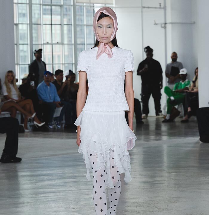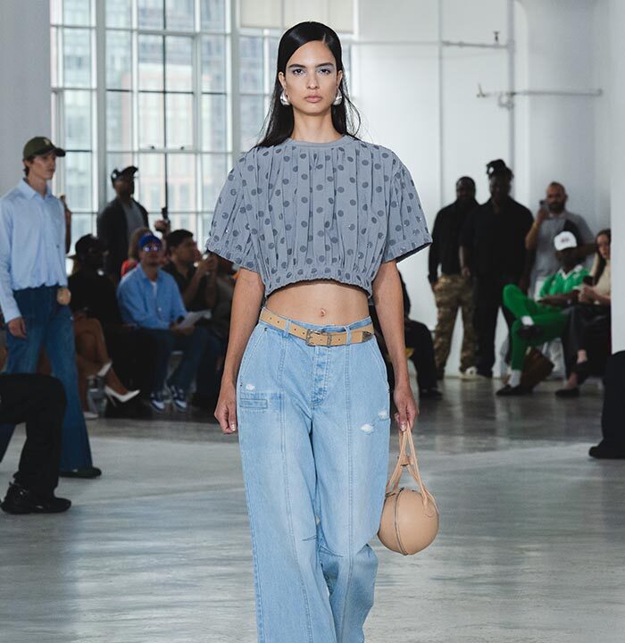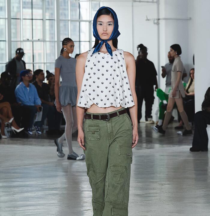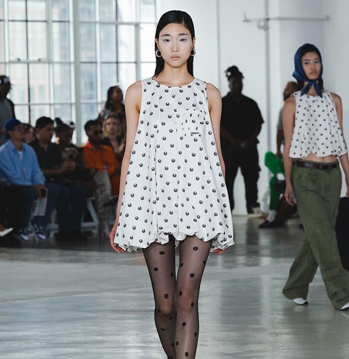 The collection opens with echoes of familiar American archetypes: the freedom of the Bohemian spirit, the resilience of denim, the utility of workwear, the optimism of preppy style. Symbols born of community and belonging are undone and reassembled through fabrics that gesture toward the unknown. Protective weaves soften into dresses as light as air. Silicone textures reimagine the polka dot into something uncanny and new. Piqué is pulled and reshaped into shirred polos. Sheer technical cloths are sculpted into jackets that hover between strength and transparency. In this shifting language, what was once ordinary takes on a second life as Future-Tech Americana.