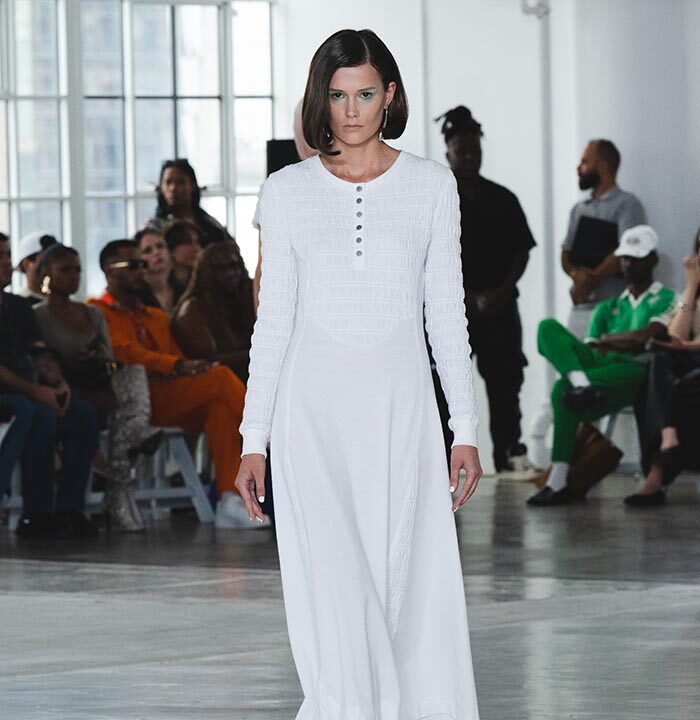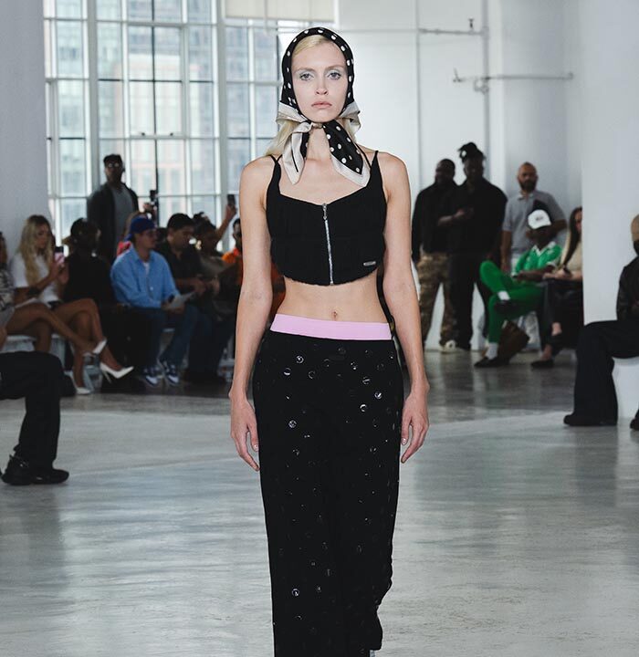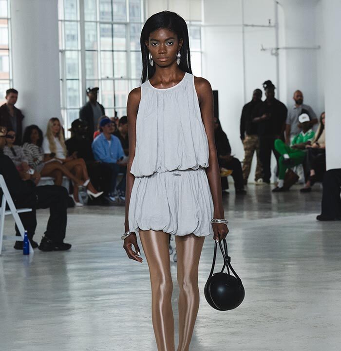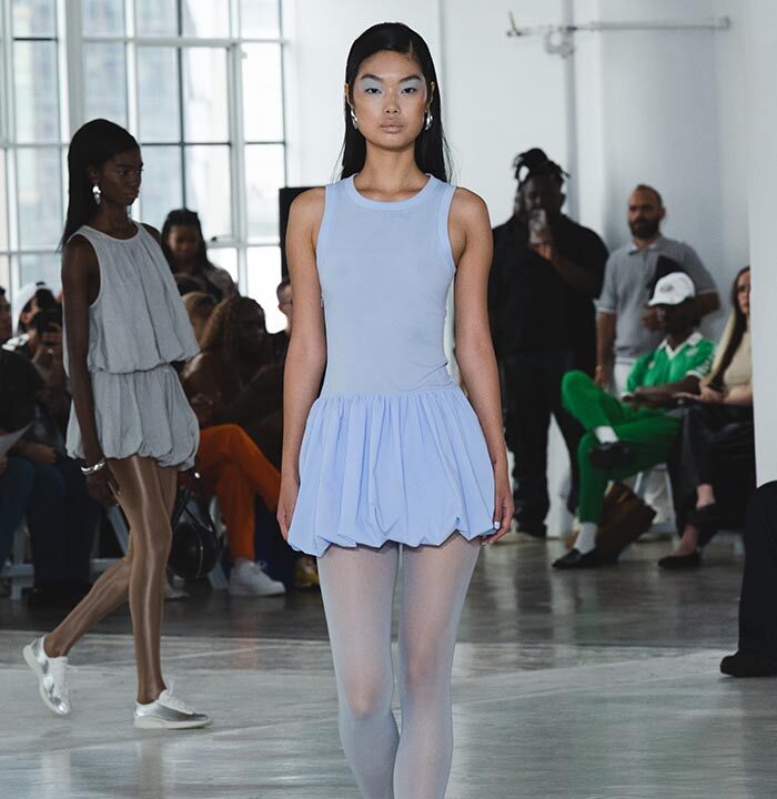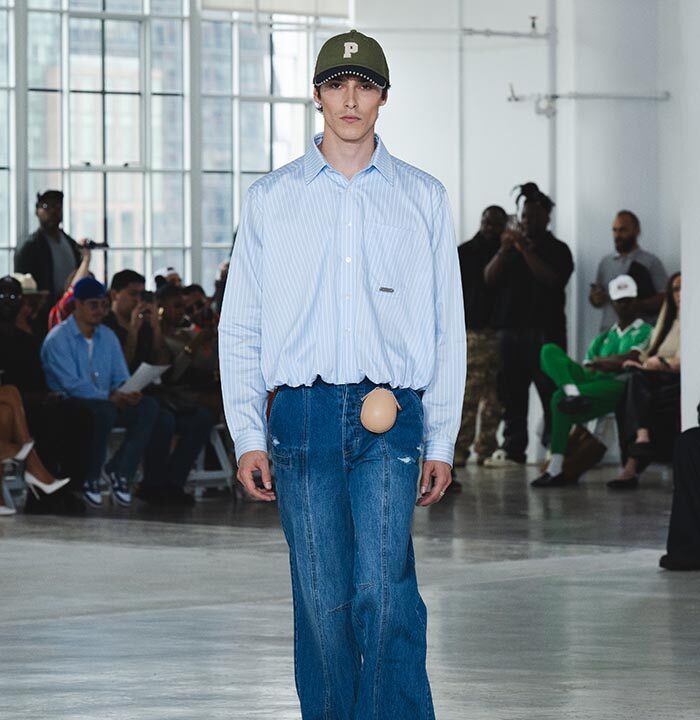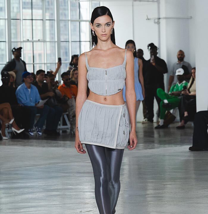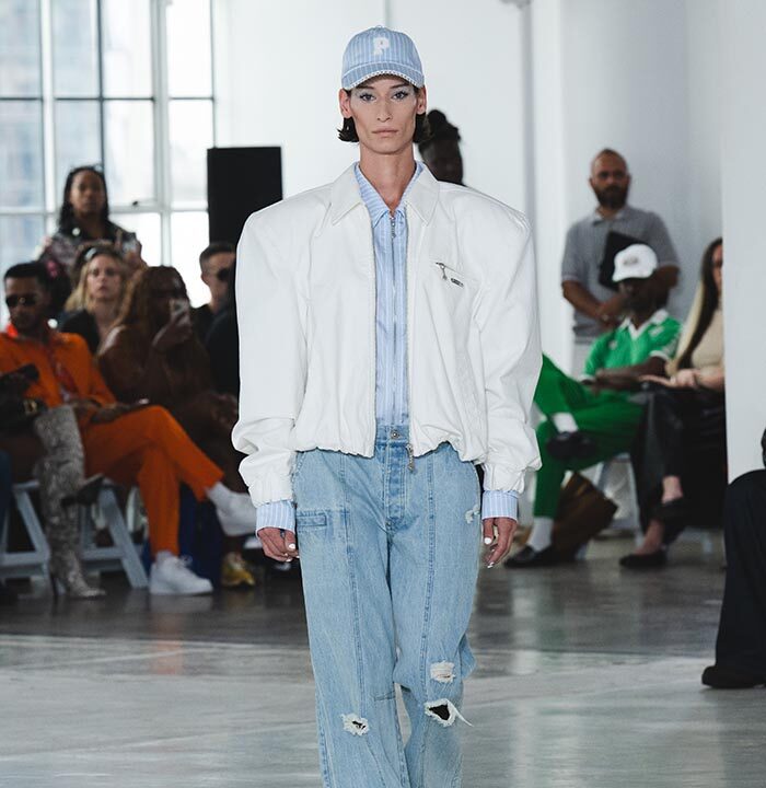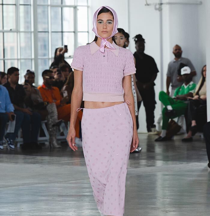 The collection opens with echoes of familiar American archetypes: the freedom of the Bohemian spirit, the resilience of denim, the utility of workwear, the optimism of preppy style. Symbols born of community and belonging are undone and reassembled through fabrics that gesture toward the unknown. Protective weaves soften into dresses as light as air. Silicone textures reimagine the polka dot into something uncanny and new. Piqué is pulled and reshaped into shirred polos. Sheer technical cloths are sculpted into jackets that hover between strength and transparency. In this shifting language, what was once ordinary takes on a second life as Future-Tech Americana.