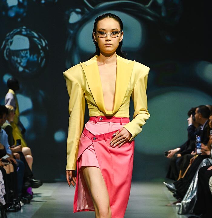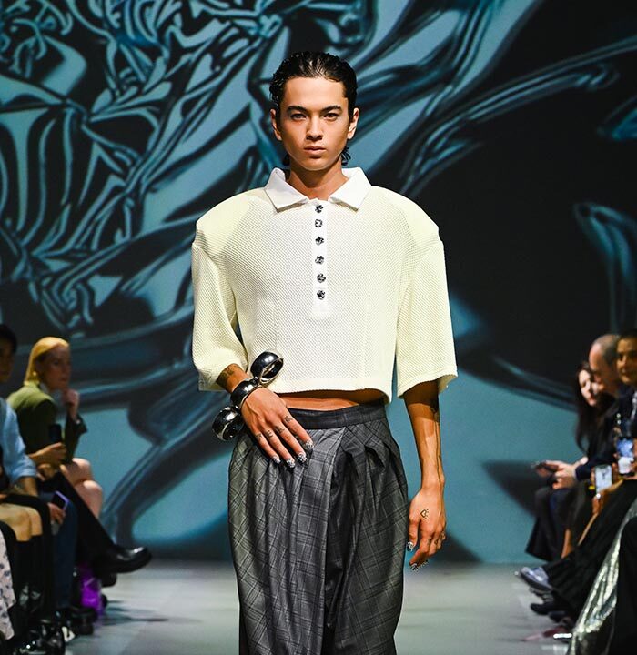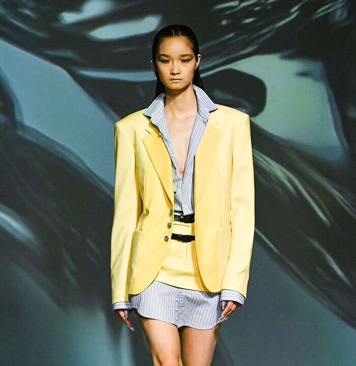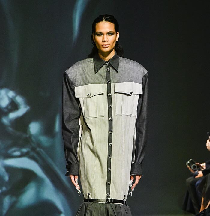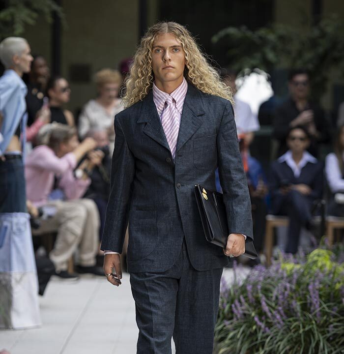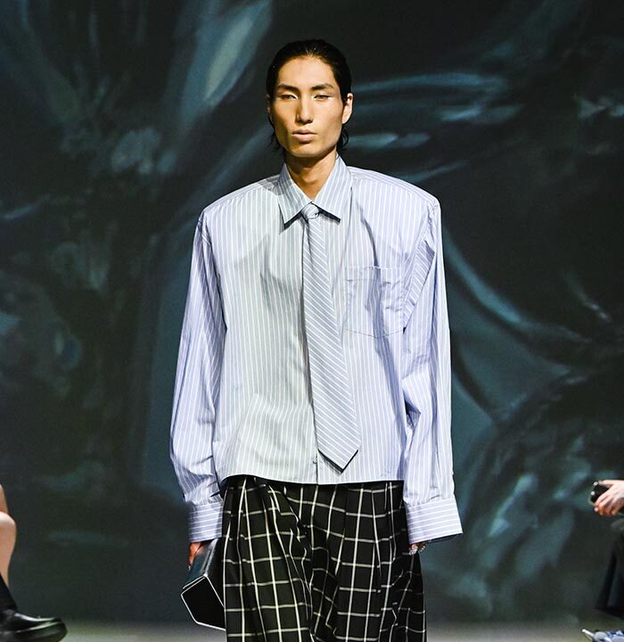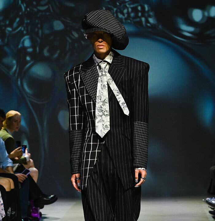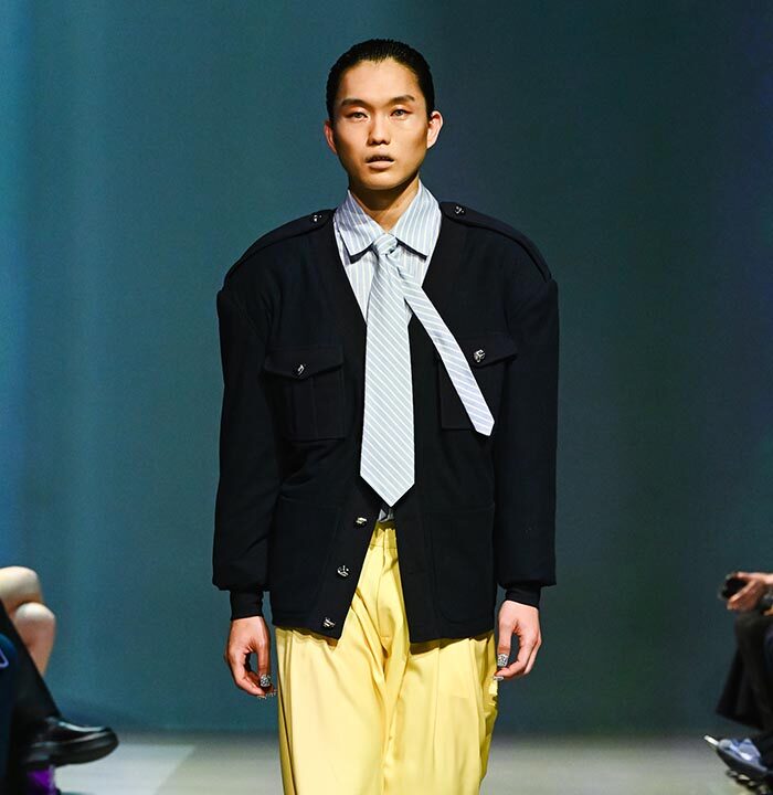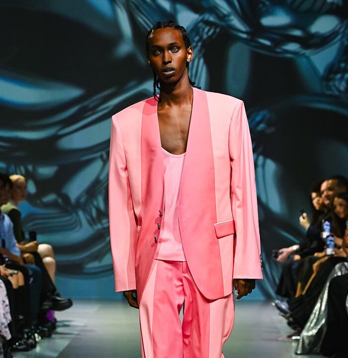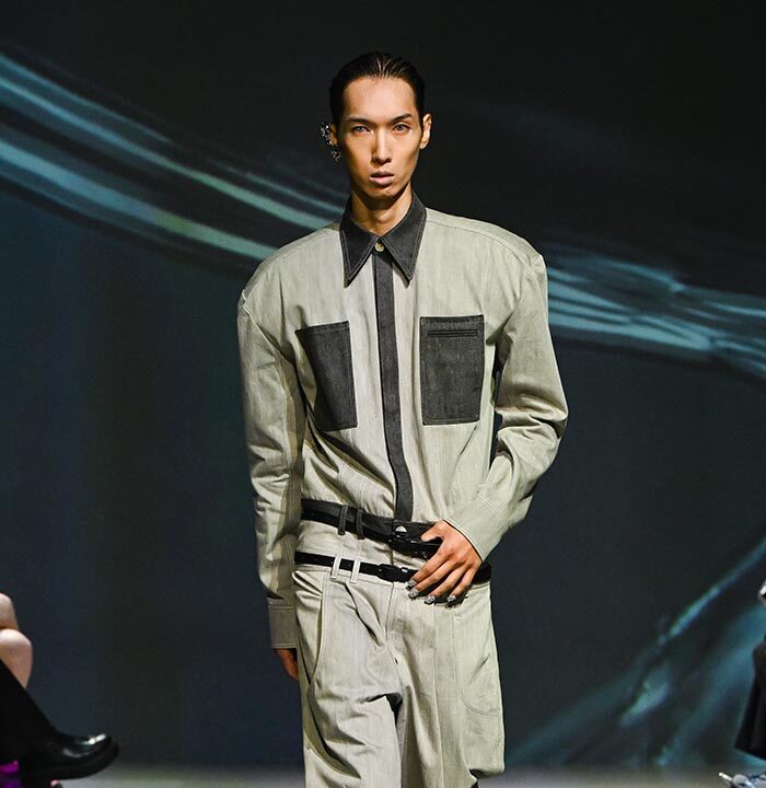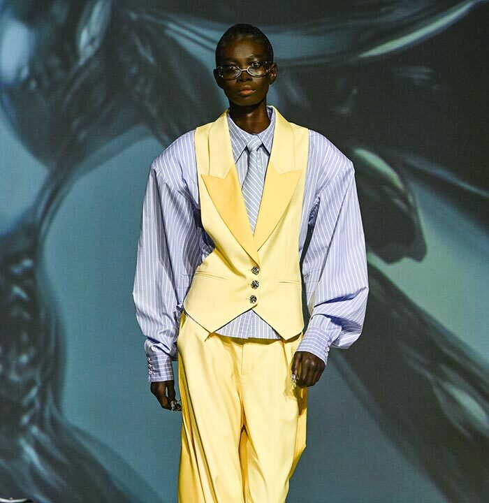 The garments themselves carry this duality with conviction. Wool suitings, pinstripes, and formal accoutrements ground the collection in a language of heritage tailoring, then fracture into trapezoidal volumes that signal another dimension. Chromefinished leathers and stripped-back denim gesture toward futures where tradition mutates but does not vanish. Pops of yellow and pink interrupt the otherwise restrained palette, while a new silhouette emerges: sharply tailored pieces balanced with strategic oversizing, maintaining proportion even as they disrupt it.
