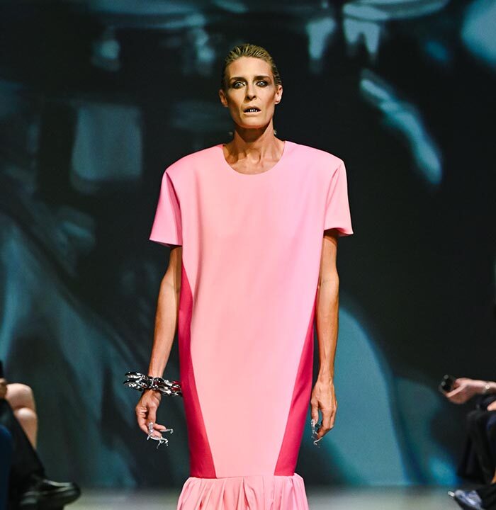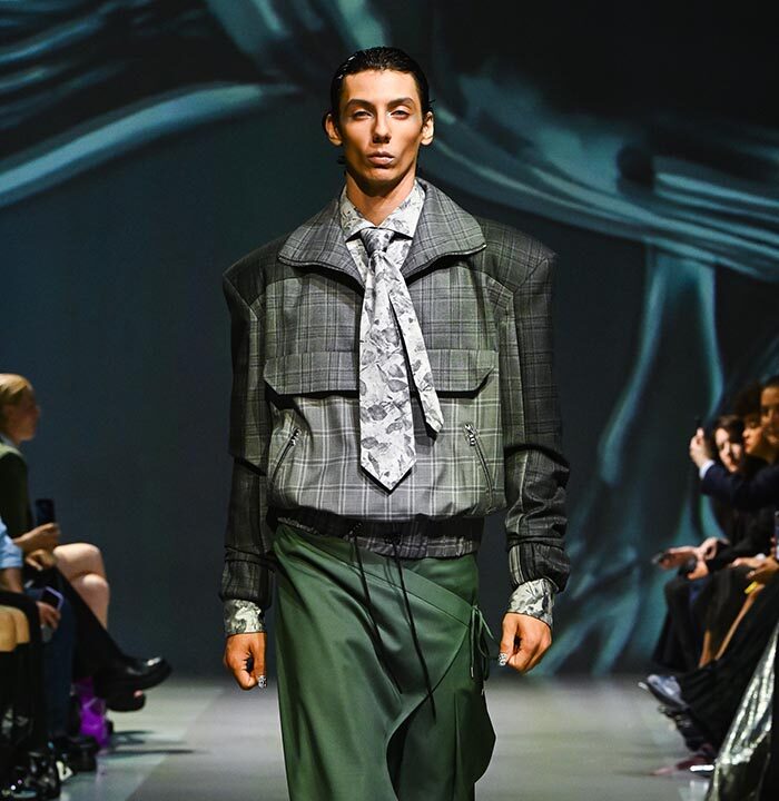 Drawing inspiration from Japanese subcultures, cosplay, and fantasy worlds, Salem merged theatrical storytelling with couture construction. Their collection, influenced by jellyfish, anime, Harajuku style, and gender fluidity, featured layered, voluminous silhouettes that blurred the boundaries between character and creator. Highlights included satin and iridescent organza baby-doll dresses, a ballerina halter dress in shimmering shantung, and a striking royal satin dress with ruffled iridescent organza detailing.