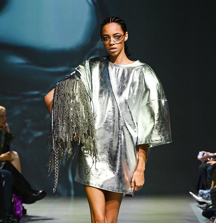 One of the standout trends at the Oh Polly x Cindy Kimberly NYFW Runway Showcase: Fringe accents elevating both tube-top mini skirt sets and elongated evening dresses (Photo Credit: Bryan Bedder, Getty Images).