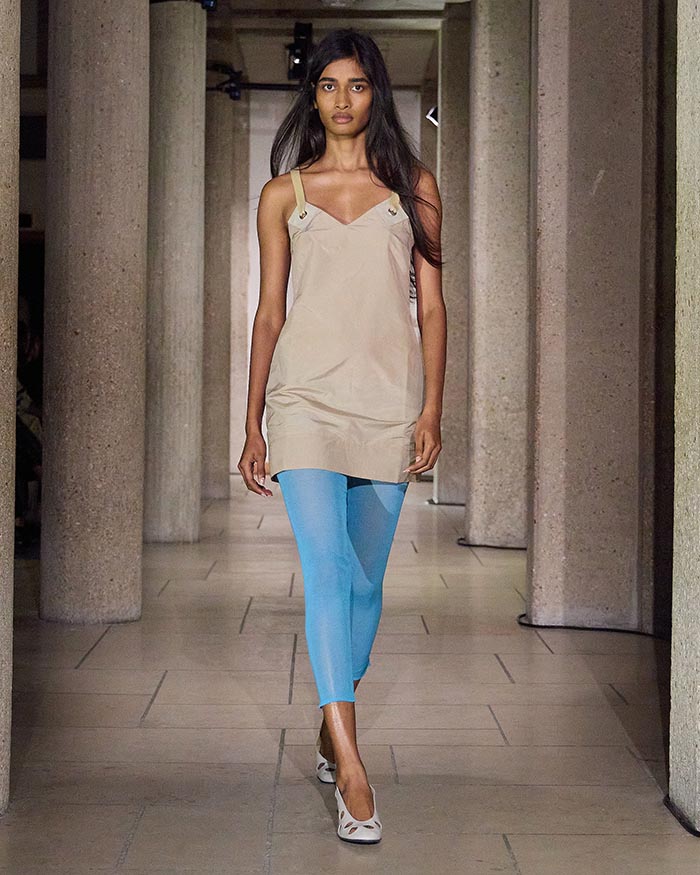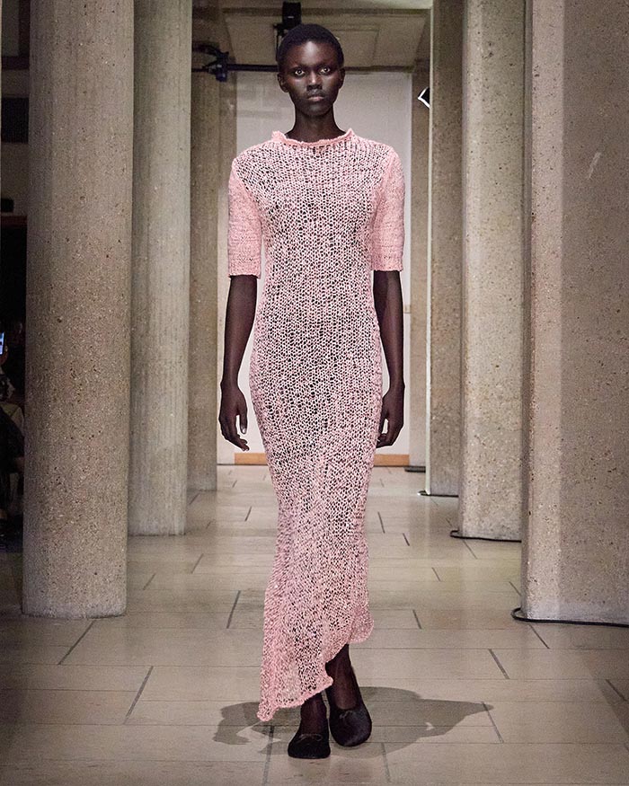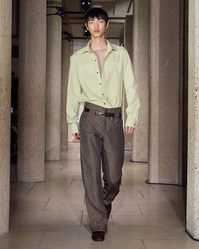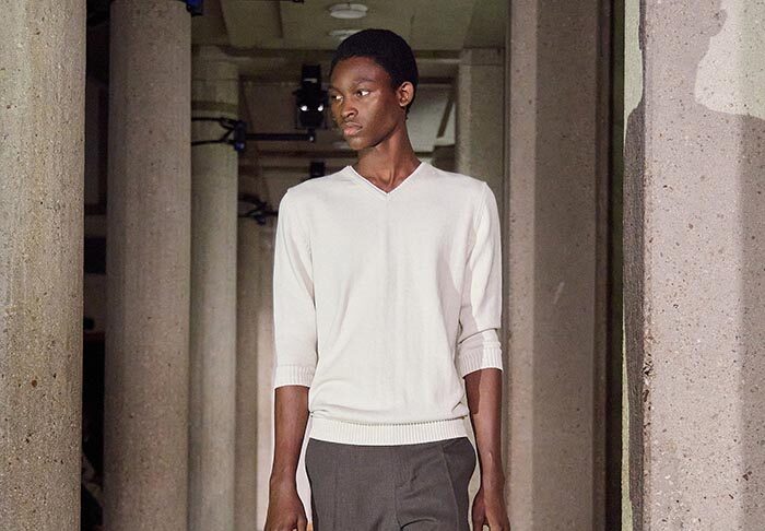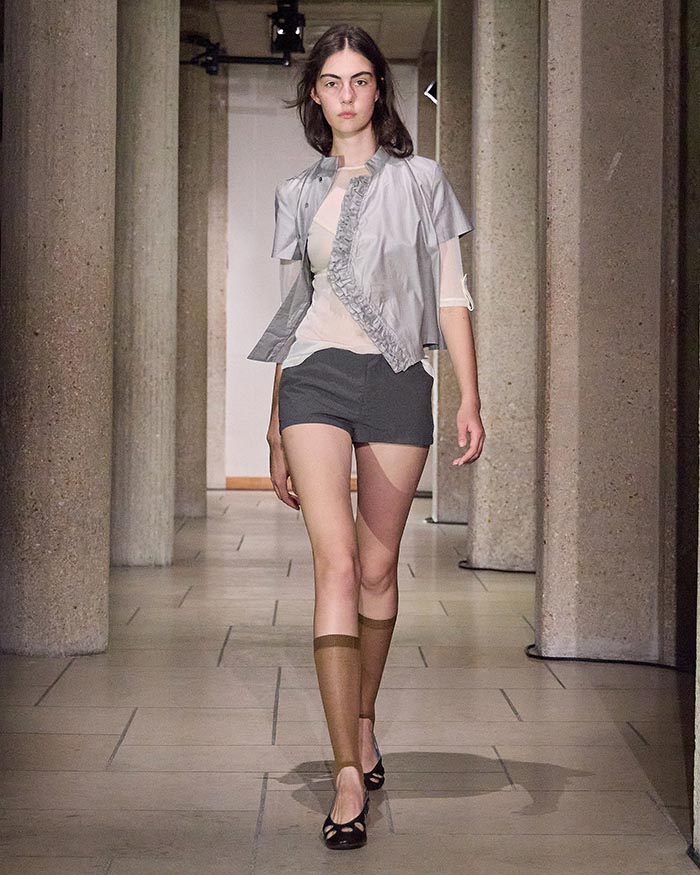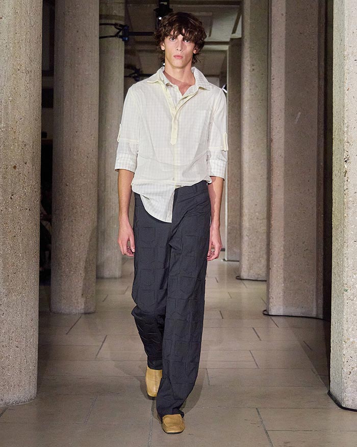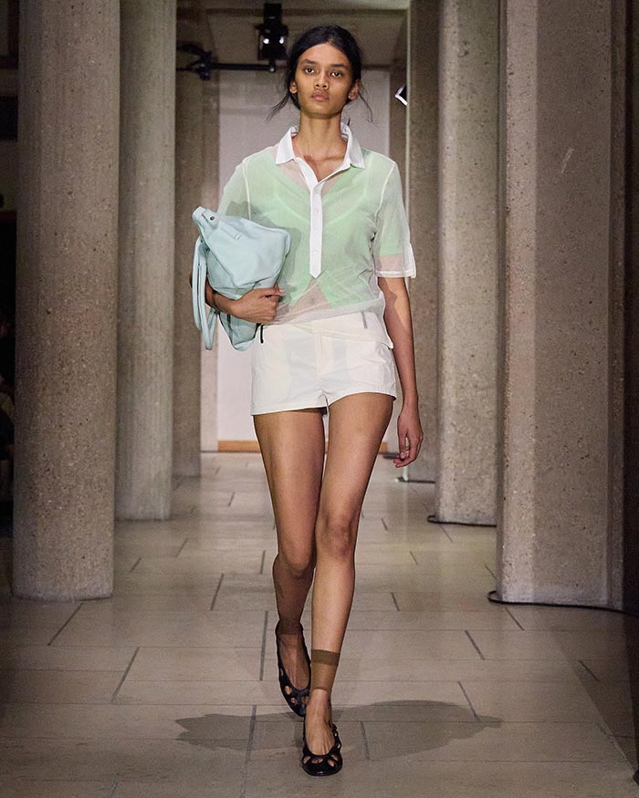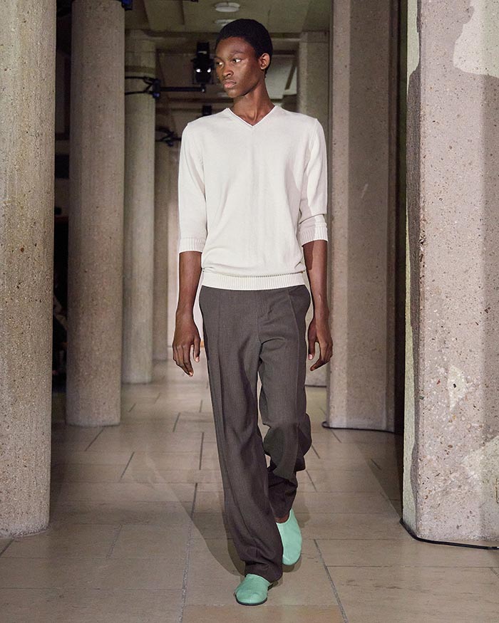 After descending to the ground floor of a quiet private hall in the 16th arrondissement, guests are welcomed into a dimly lit space where the models’ silhouettes are projected in large scale across the walls. In this shimmering environment, the collection emerges with the ease of a summer breeze.