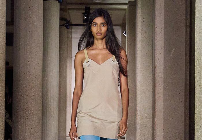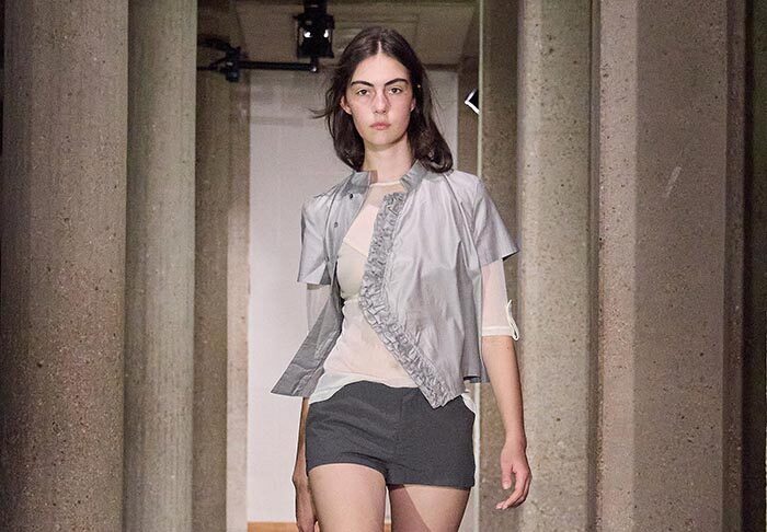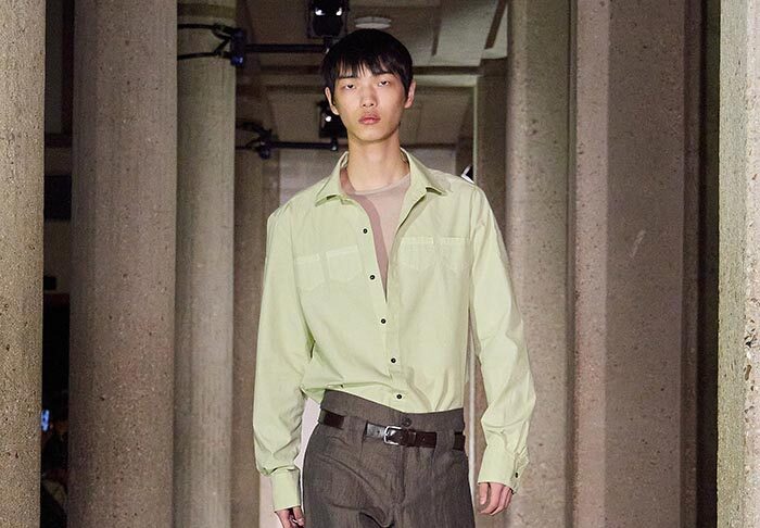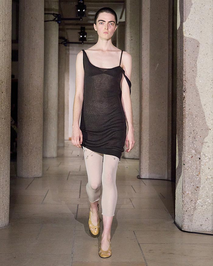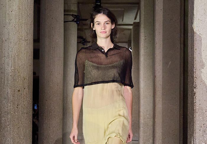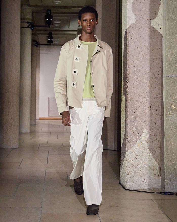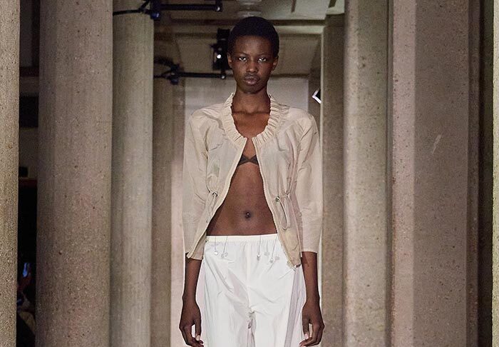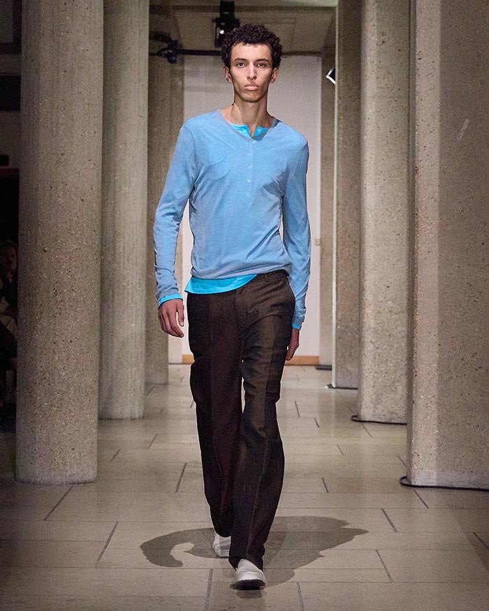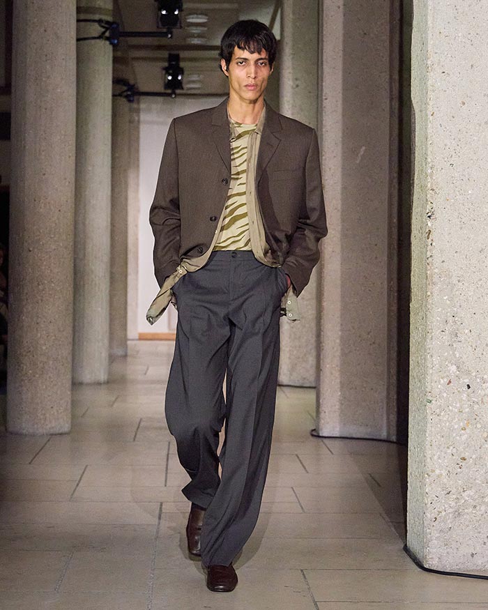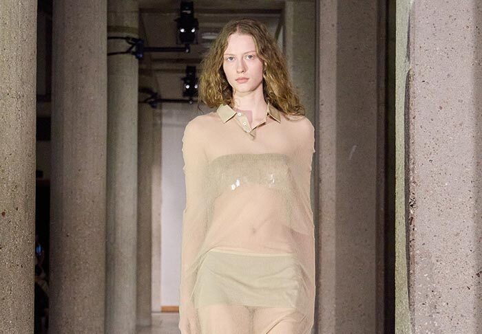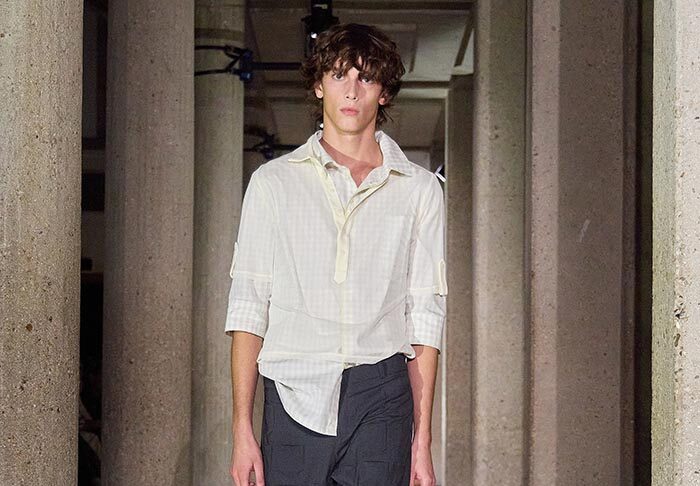 After descending to the ground floor of a quiet private hall in the 16th arrondissement, guests are welcomed into a dimly lit space where the models’ silhouettes are projected in large scale across the walls. In this shimmering environment, the collection emerges with the ease of a summer breeze.