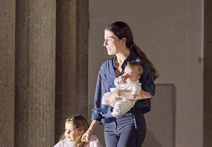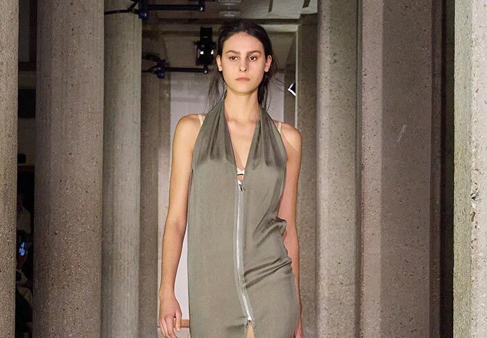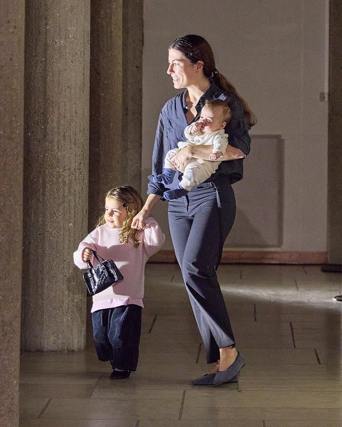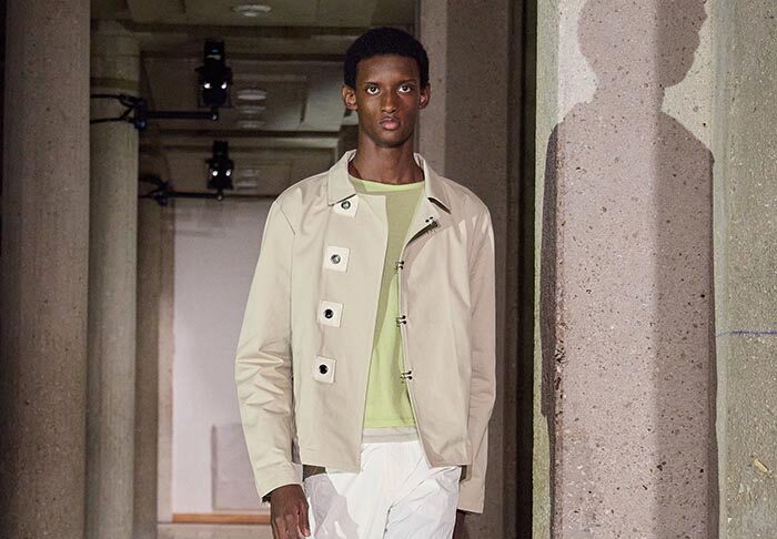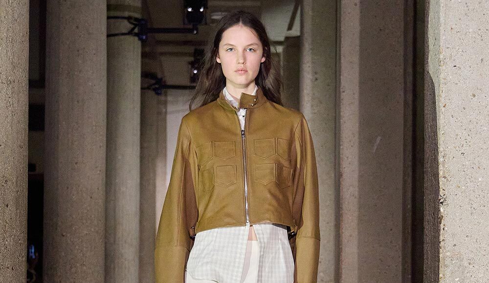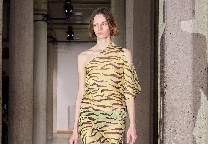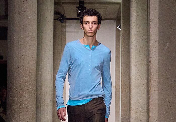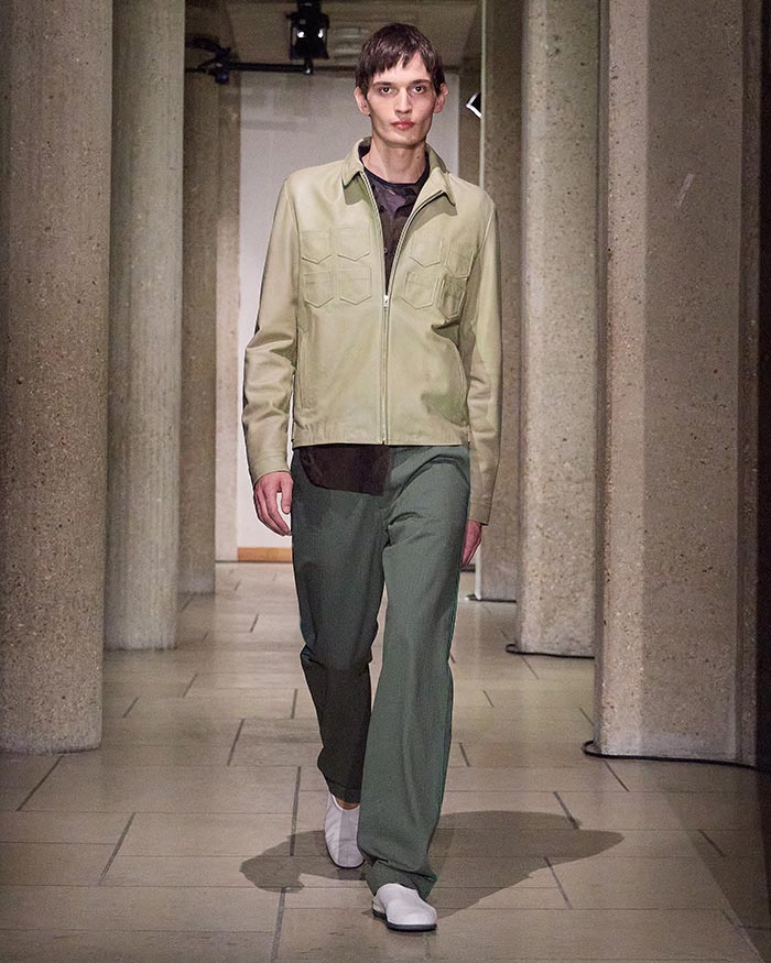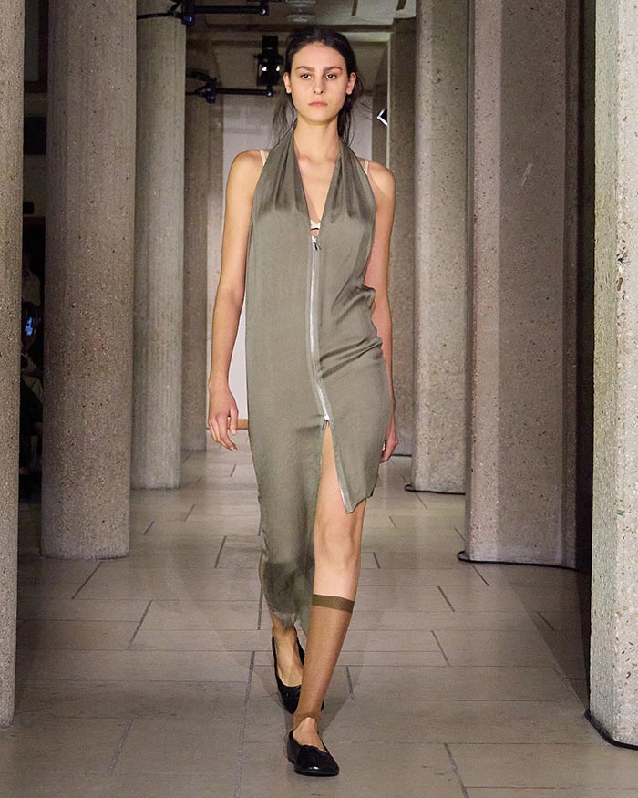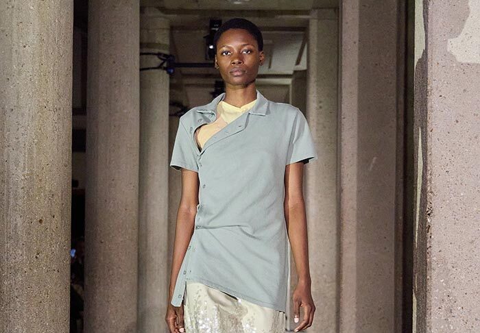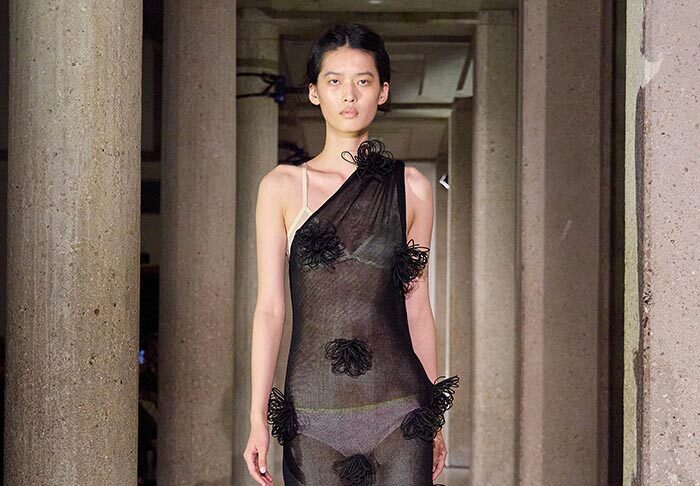 After descending to the ground floor of a quiet private hall in the 16th arrondissement, guests are welcomed into a dimly lit space where the models’ silhouettes are projected in large scale across the walls. In this shimmering environment, the collection emerges with the ease of a summer breeze.
