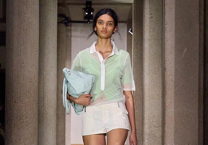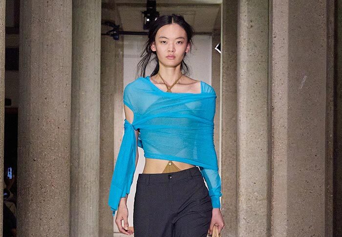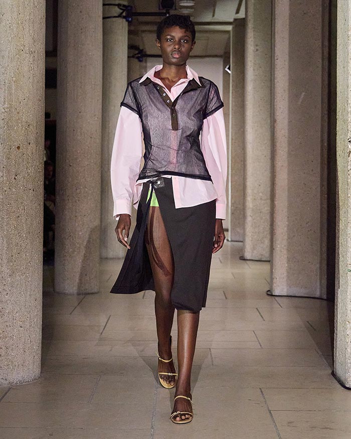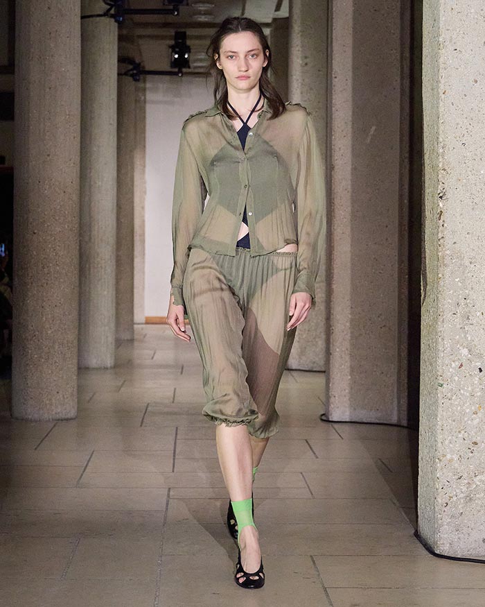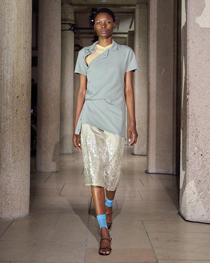 Transparencies in gauzy silk and mesh reveal delicate undergarments trimmed in contrasting hues. Fine knit leggings peek out beneath layered pieces. Cyan and neon green energize sandy neutrals, while diaphanous capes drape across shoulders and arms. Sequins glimmer subtly within delicate hand-knitted pieces, sometimes shining through lightweight fabrics. Miniature pockets are scattered throughout. Shirts and polos with side button closures, recalling the construction of baby bodysuits, nod to Paloma’s recent motherhood. Perforated leather pumps with polka-dot motifs complete the looks.