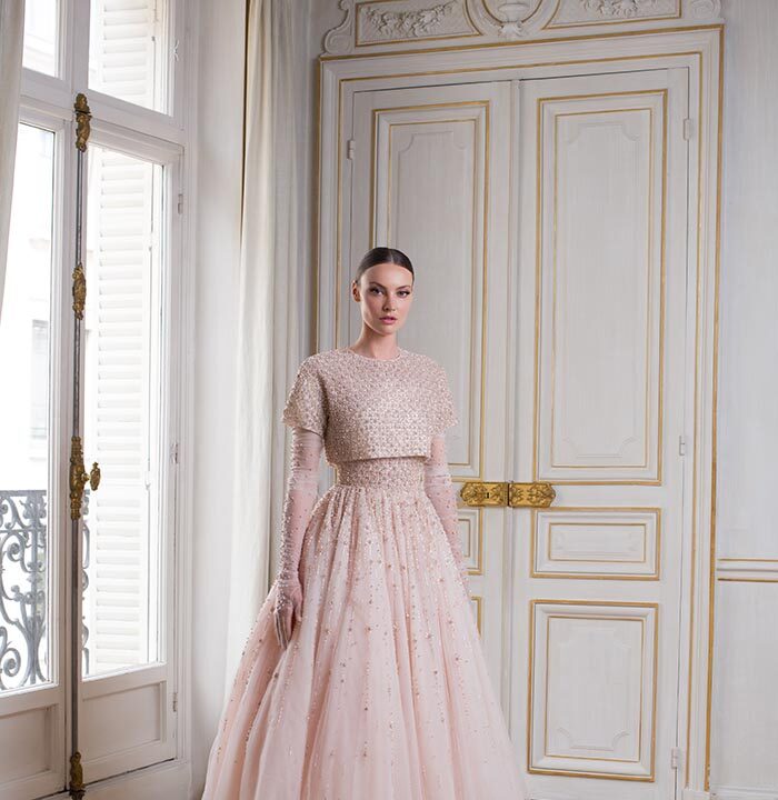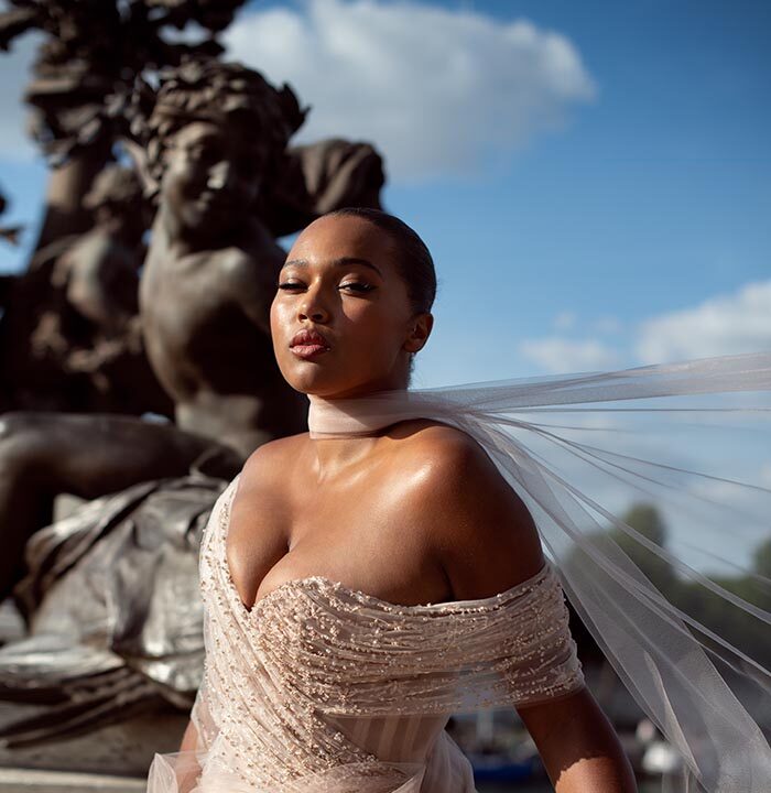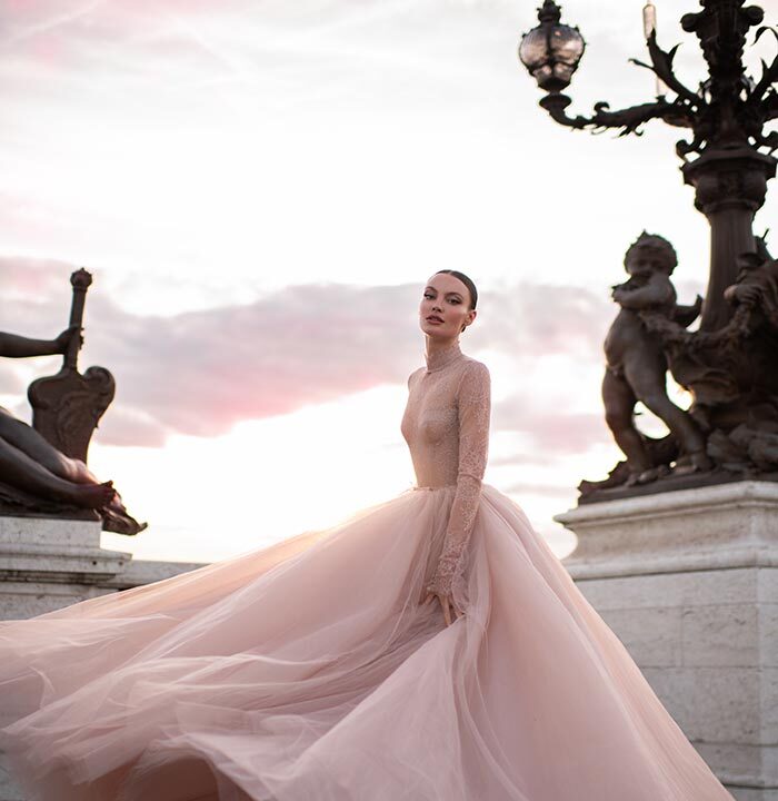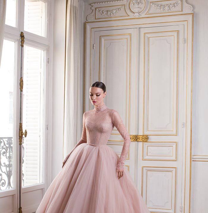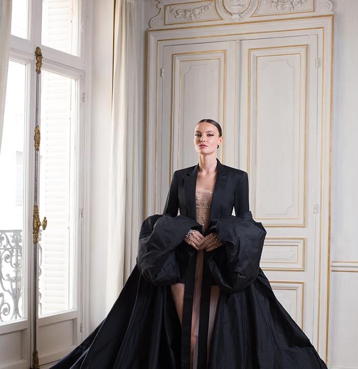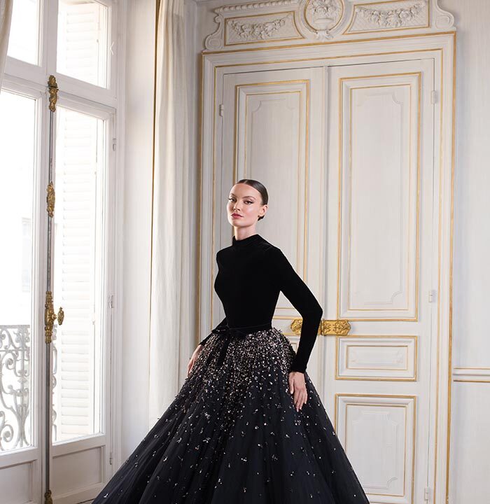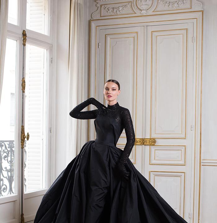 Luminary is a striking and elegant collection with a distinctive colour palette of noir, argile, and rose clair. Masculine meets feminine with a thrilling combination of sharp tailoring, corsetry, and high necklines effortlessly balanced with romantic ball gown silhouettes of illusion tulle and sensual body-skimming column dresses. Intricate geometric beadwork of paillette and Swarovski crystal set the scene for a truly exquisite finish.