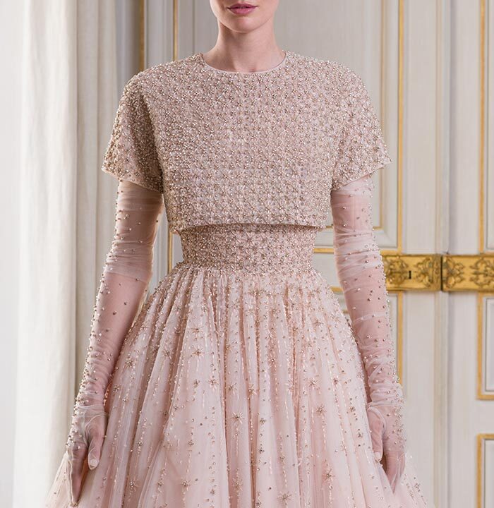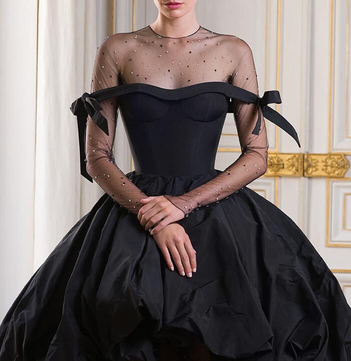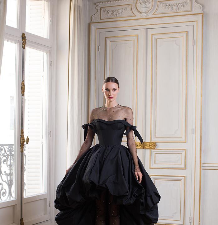 “We spread our wings with this collection by incorporating a slightly darker and more moody palette, utilising different styles such as the bubble skirt — which was originally first seen in 1950s Paris — and incorporating new details like crystal-embellished sheer gloves.”