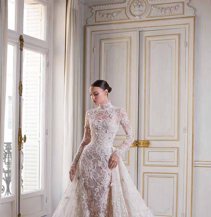 Standout pieces from Luminary include the strapless ballerina dress in crystal honeycomb beadwork, the velvet open-back tuxedo, and the low-back silk faille gown with embroidered beaded mesh overlay. The featured couture wedding dress is an Italian corded lace column gown with floor-length caped overskirt, embellished florals, and cathedral veil.