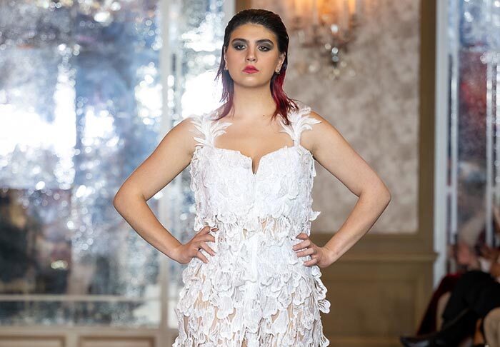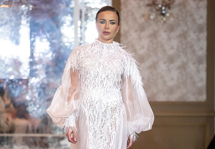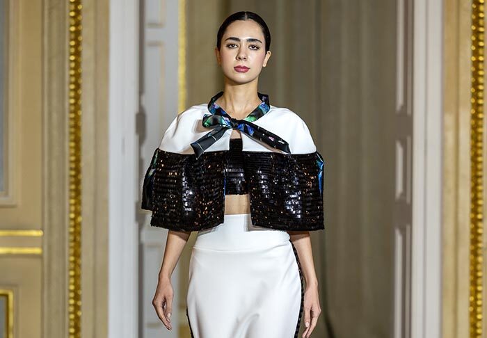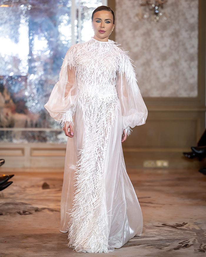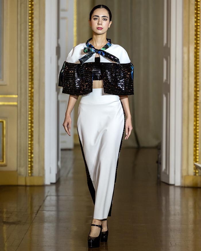 IRA LANGEVIN — the fashion house founded by designer, playwright, and diplomat Ira Langevin — presented her collection “She Who Knows.” It is not simply a collection — it is a manifesto. The collection presents a striking dialogue between softness and strength, where sculptural silhouettes meet fluid movement. Ethereal gowns in lavender gradients float like mist, crafted from delicately pleated fabrics that cascade around the body with weightless grace. Black-and-white geometric compositions add a graphic edge, while voluminous whites adorned with feather-like detailing introduce a sense of celestial purity. Built on duality, it contrasts architectural structure with fluid drapery, concealment with bold cuts — reminding us that true strength is not loud, but deeply felt.