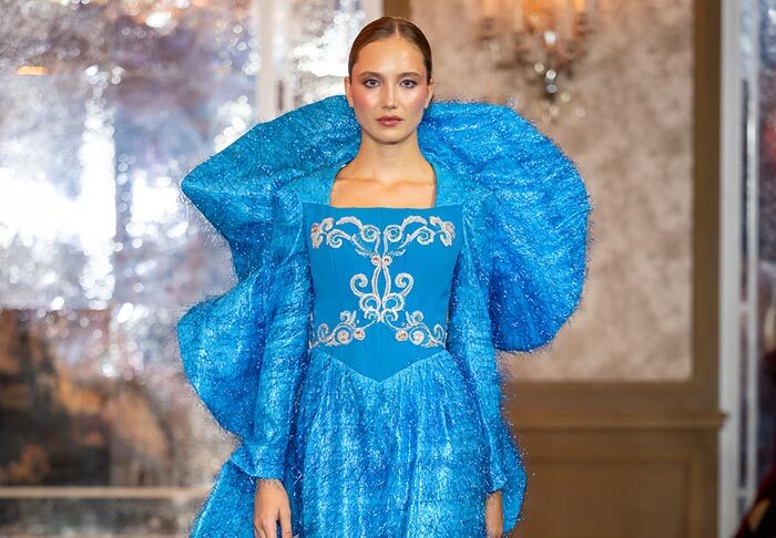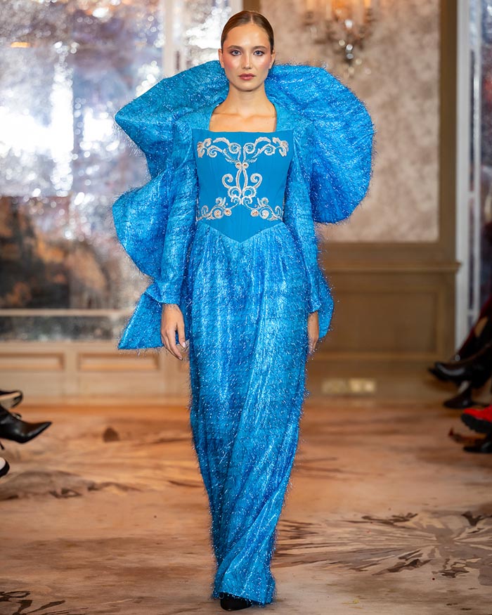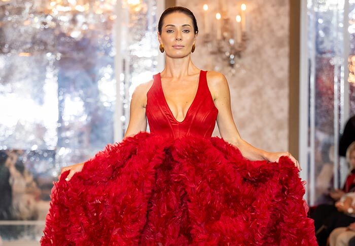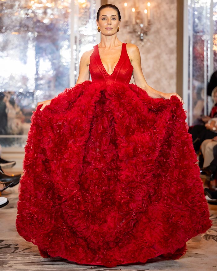 Keti Chkhikvadze, designer of MAISON KETI, unveiled a striking collection defined by sculptural silhouettes, cascading movement, and a celebration of unapologetic femininity. Signature to her style, the looks combined structured volume with fluid motion — from tiered ruffles in playful polka dots and vivid florals to romantic white ensembles crafted from sheer tulle and petal-like appliqués. Bold red and electric blue prints evoked joy and nostalgia, while black and white looks added a sense of timeless drama with hand-embroidered gold motifs and velvety textures. Each piece danced between tradition and fantasy, capturing the spirit of a woman who is powerful yet poetic, grounded in heritage yet unafraid to dream.