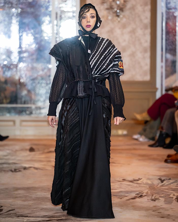Kharchi’s collection stepped onto the Paris runway like a silent yet powerful hymn — draped in deep blacks, layered textures, and sculptural silhouettes that felt both ancestral and avant-garde. Quilted jackets, gathered skirts, veiled headpieces, and hand-stitched patchwork reimagined traditional Georgian elements with a contemporary, almost ceremonial aura. Every look felt like a poem of contrasts: raw yet refined, modest yet magnetic, grounded yet spiritual.
