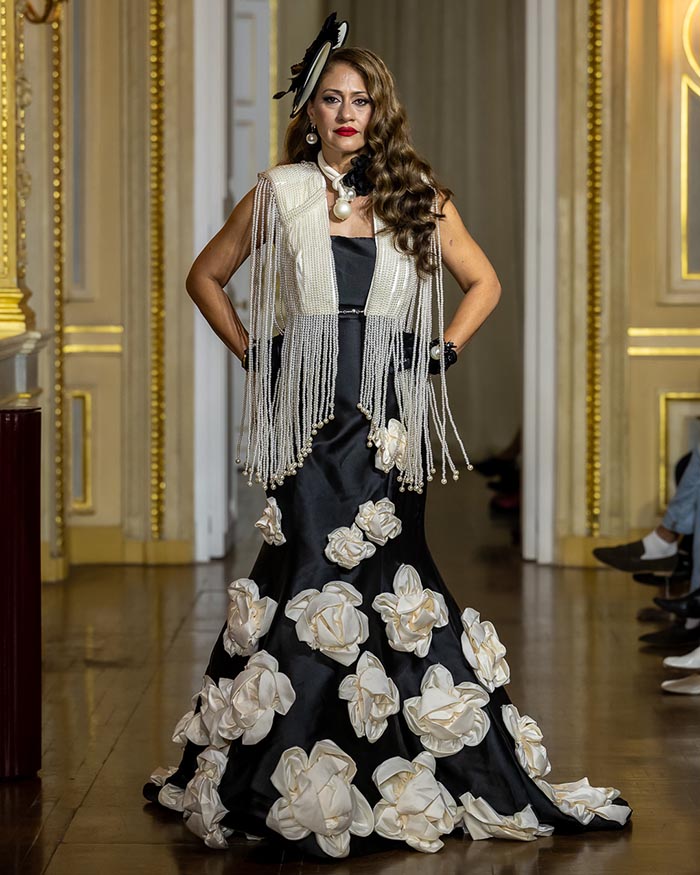 Lennin Villarroel, the celebrated Venezuelan designer based in Santiago, Chile, unveiled a collection that paid tribute to the duality of feminine power — fierce yet graceful, sensual yet composed. His signature aesthetic, beloved across Latin America, came to life through sculpted silhouettes, deep necklines, and masterful embroidery that highlighted the contours of the body without overpowering it.