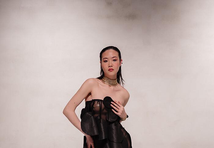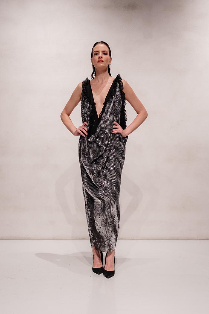The collection features column, slip, and tailored minimal silhouettes with elongated lines and bare shoulders. Details include asymmetry, off-shoulder cuts, open backs, restrained draping, and subtle hardware, emphasising intention over ornamentation. The mood is one of quiet confidence, sensual control, and intellectual femininity.