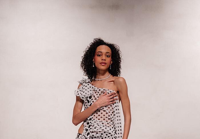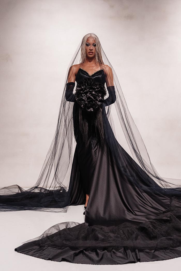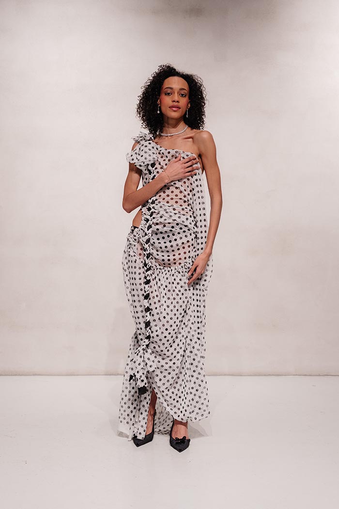 A narrative of reclaiming identity and crafting femininity on your own terms is reflected not only through design but also through the show’s diverse casting. The lineup included Elton Ilirjani (@eilirjani), Elliott with 2 T’s (@therealelliottqueen), and Tayce (@itstayce) who closed the show in a reimagining of Princess Diana’s wedding dress. This choice underlines the show’s central message. Femininity is not granted, it is claimed, crafted and resilient. Bridgerton actress and former elite athlete Genevieve Chenneour (@genevievechenneour) also joined the runway, bringing a different facet of modern womanhood shaped by discipline.