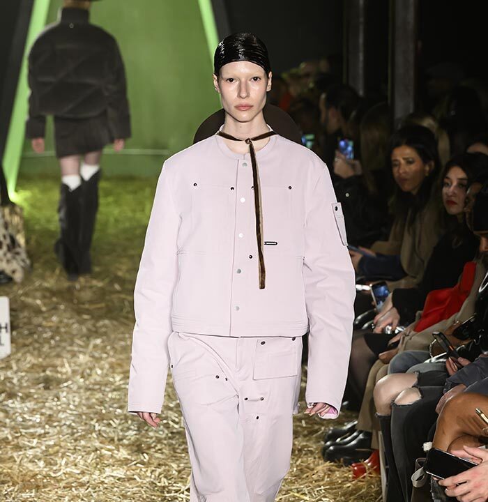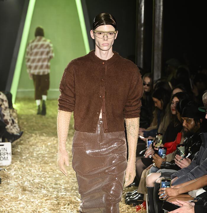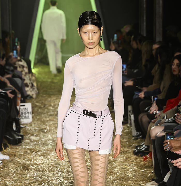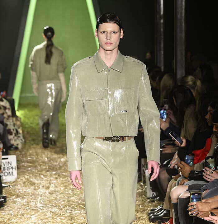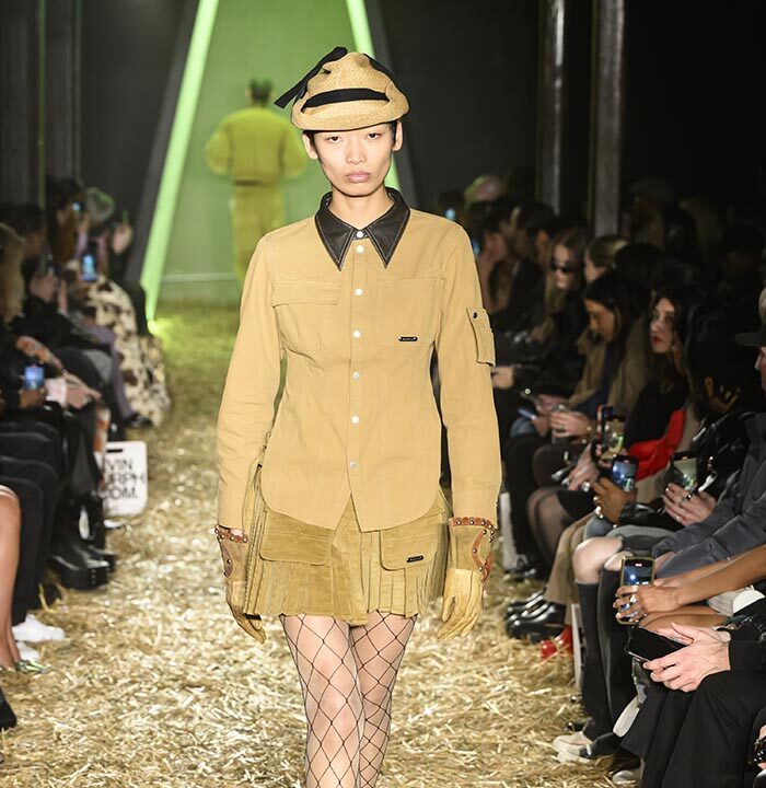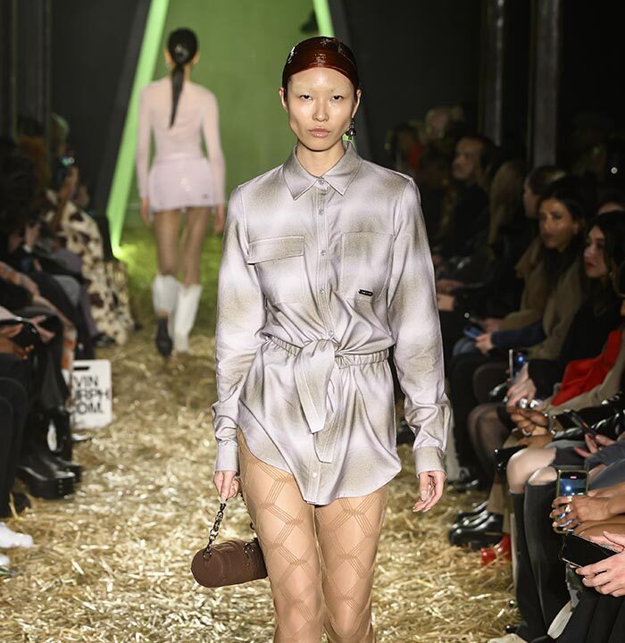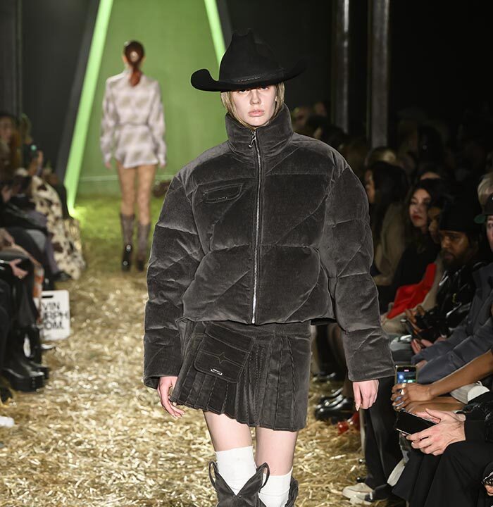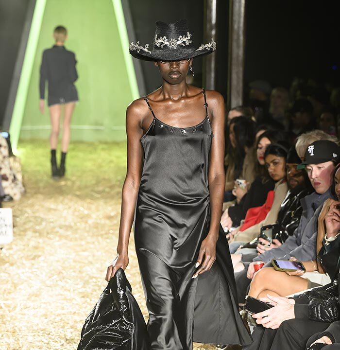 Drawing inspiration from the untamed spirit of America’s 19th century Wild West, our runway presentation skillfully interlaces aesthetics with ranch workwear details. Innovative techniques, including raised 3D silicone textured surfaces and metal ball chain bead weaving create a striking contrast of distressed denim and printed plaid cotton, especially against soft, romantically draped fabrics and high-shine metal hardware. The silver pieces, presented in clean silhouettes with utilitarian details, serve as a visual metaphor for the convergence of technology and cowboy aesthetics, embodying the multifaceted nature of the AI landscape.