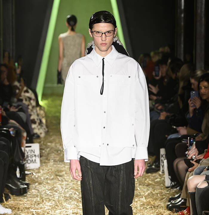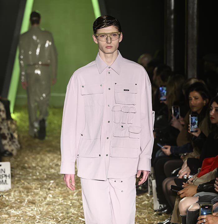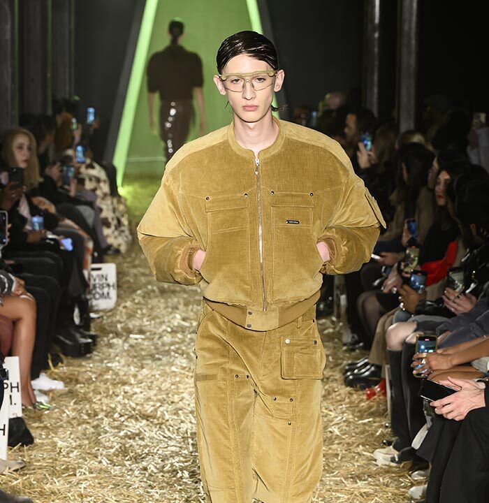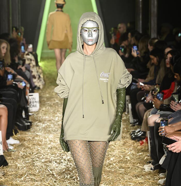 Our show set features a constructed fashion tunnel, both real and metaphorical: it is the physical structure through which the models enter the runway, but also the embodiment of the idea that our future with AI is still unknown… Yet there is hope at the end of this tunnel! The juxtaposition here between the natural and the technological mirrors modern tensions between fear and excitement, lawlessness and freedom, all of which AI skates the lines betwixt.