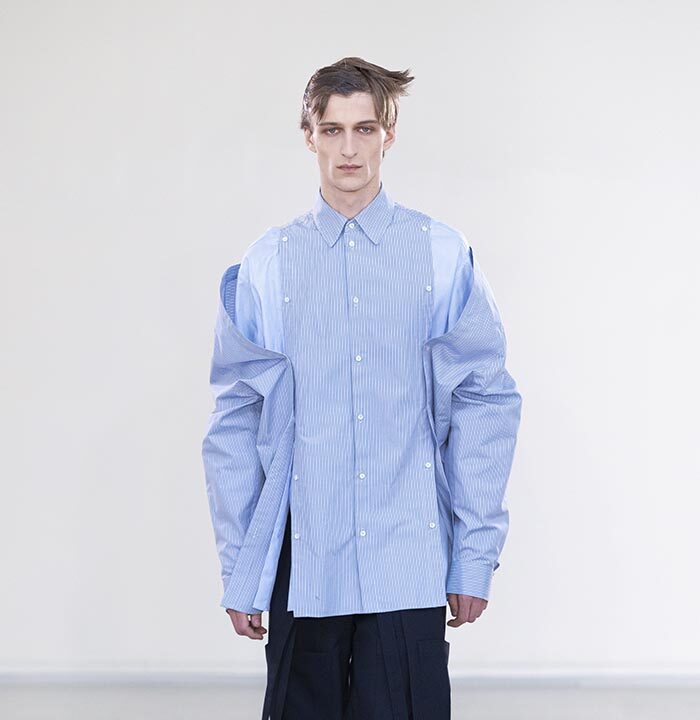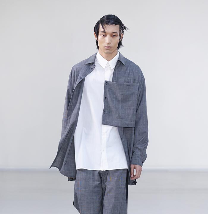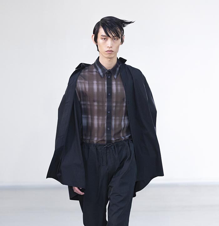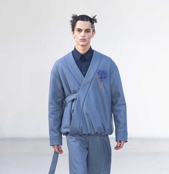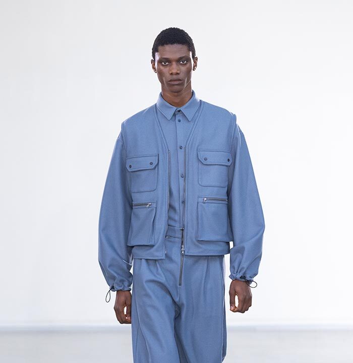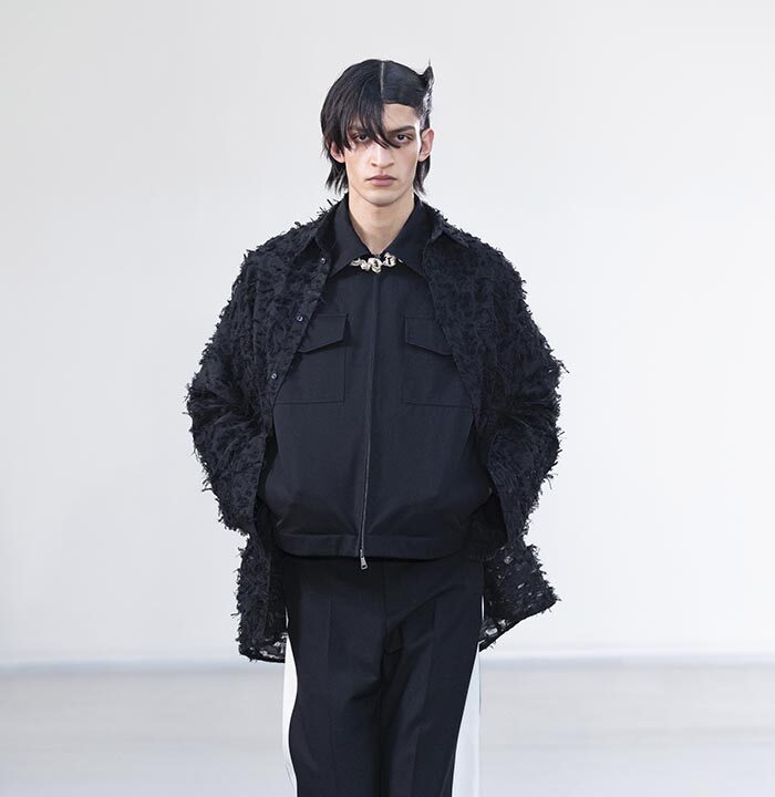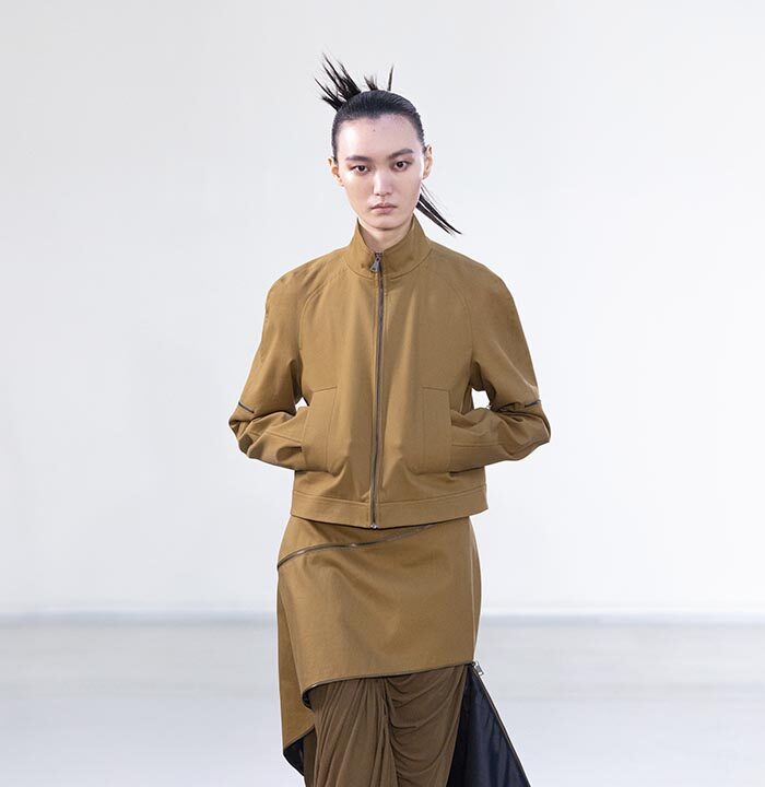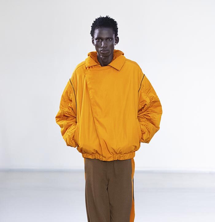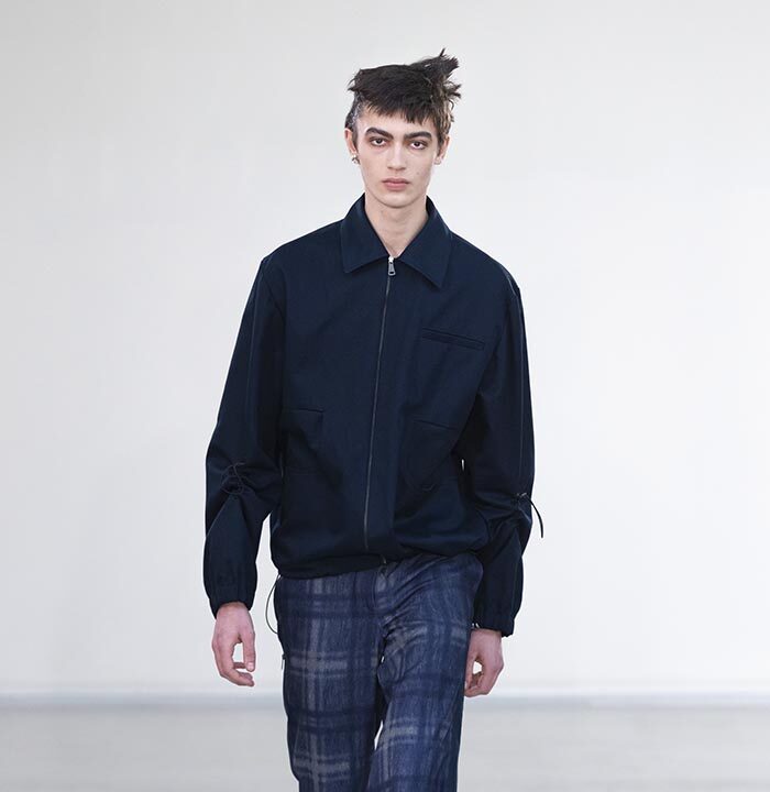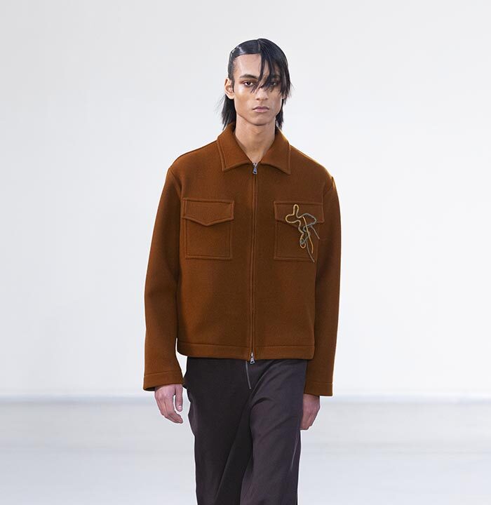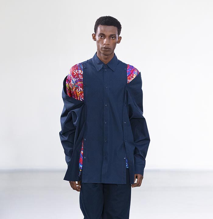 With Karaka’s work the seed of inspiration for AW25, the collection blooms into life in a series of signatures QASIMI is known for. Louche shirts matched with loose trousers speak of the silhouettes of the Middle East and North Africa, while slouchy windbreakers and worn-in hoodies emphasise the casual ease inherent to the house. Sleek tailoring is softened through curved shoulders and roomy fits, and outerwear, as ever. Further expanding QASIMI’s proclivity for modular clothing, throughout the AW25 collection are details allowing the wearer to create their own unique garments, with zips, studs, buttons, and adjustable seams allowing transformation in seconds – the shadow of a shirt sleeve becomes a contemporary artwork in itself, while a simple A- line skirt cuts away to become a unique spiral that snakes down the legs, revealing as little, or as much, as desired.