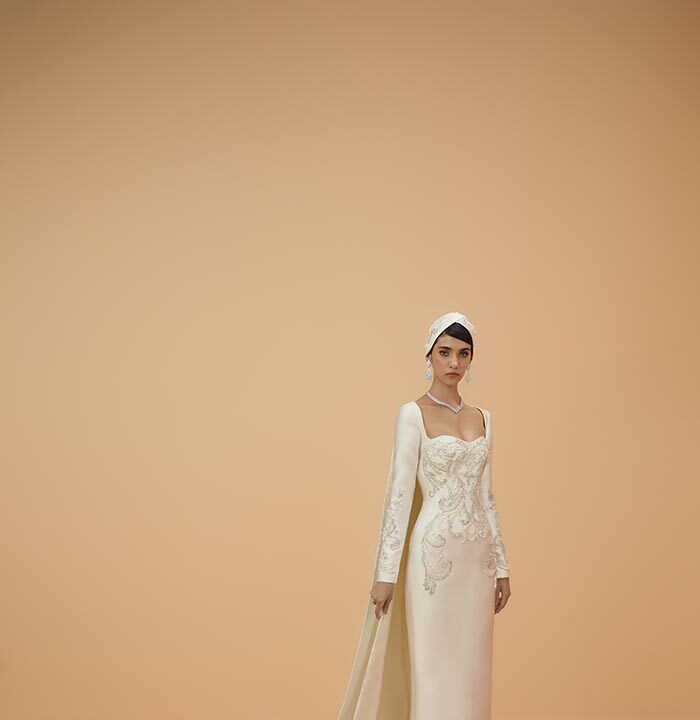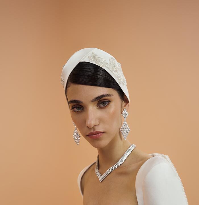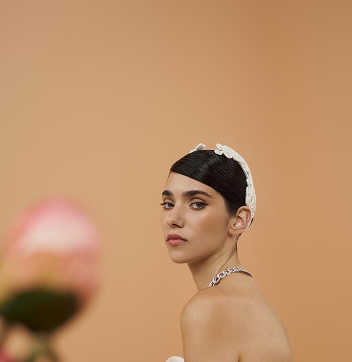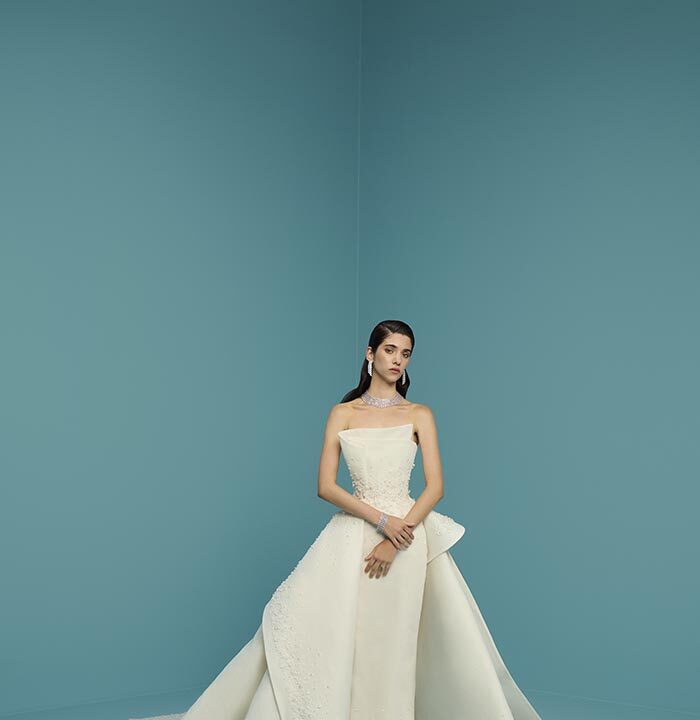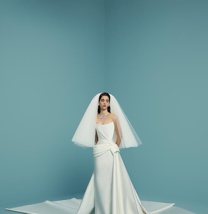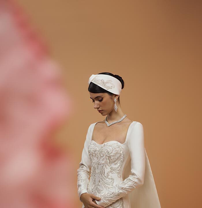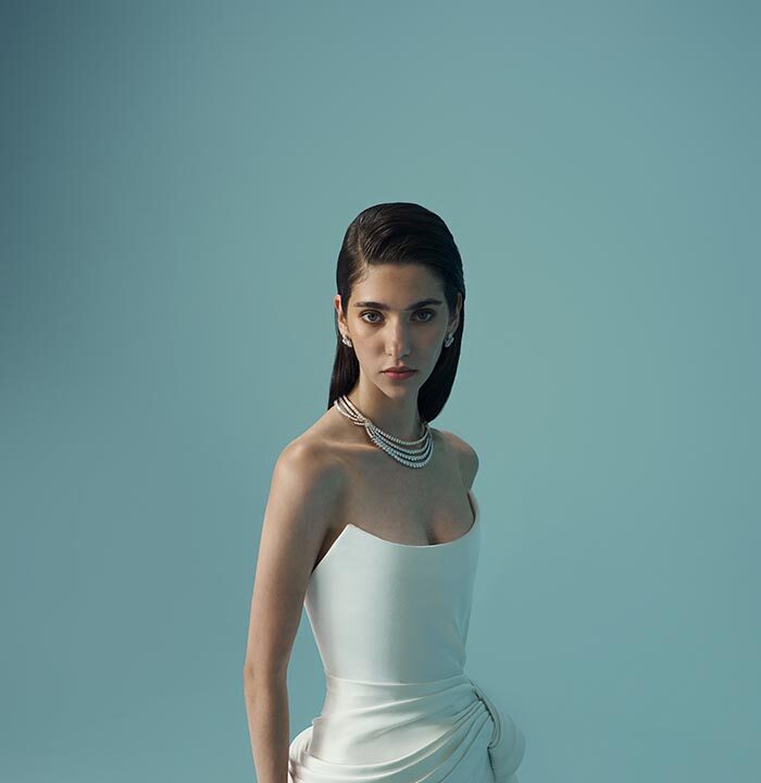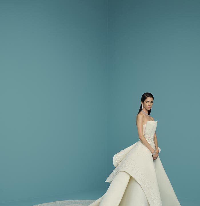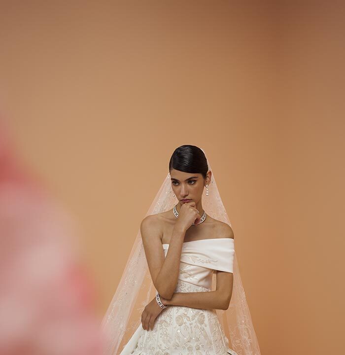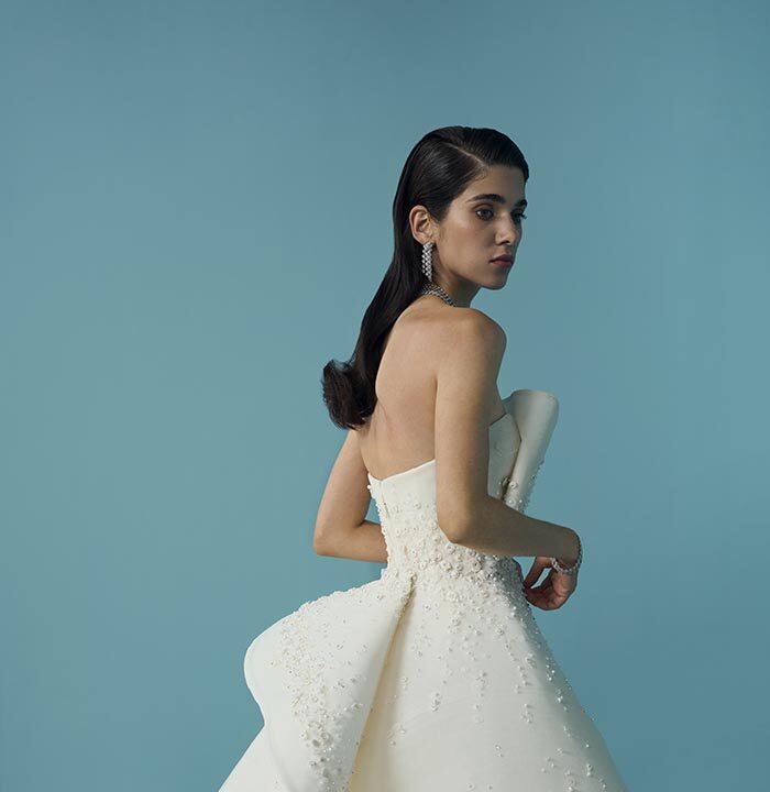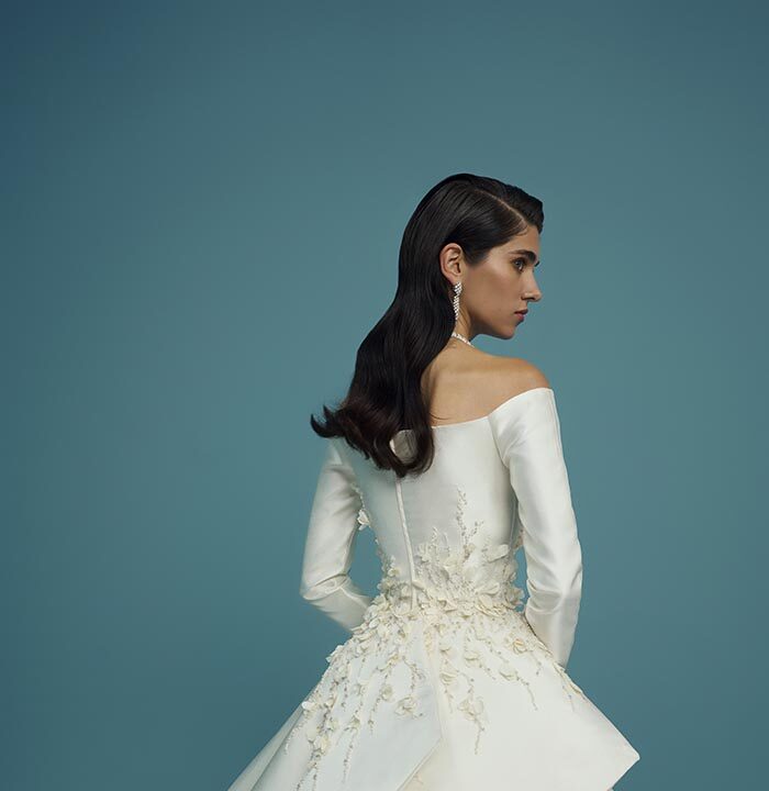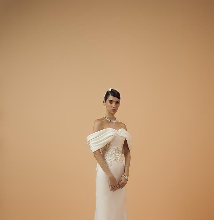 Inspired by the dynamic interplay of art and love, this collection showcases striking structural silhouettes paired with delicate romantic accents. Featuring a refined palette of pristine off-white hues, each gown is crafted from luxurious fabrics like scuba satin, airy silk tulle, and sumptuous Mikado satin, creating effortless pieces that radiate elegance and confidence.