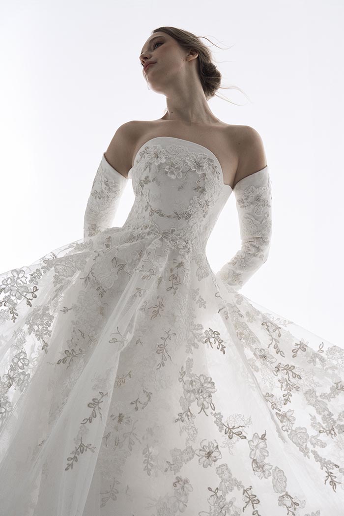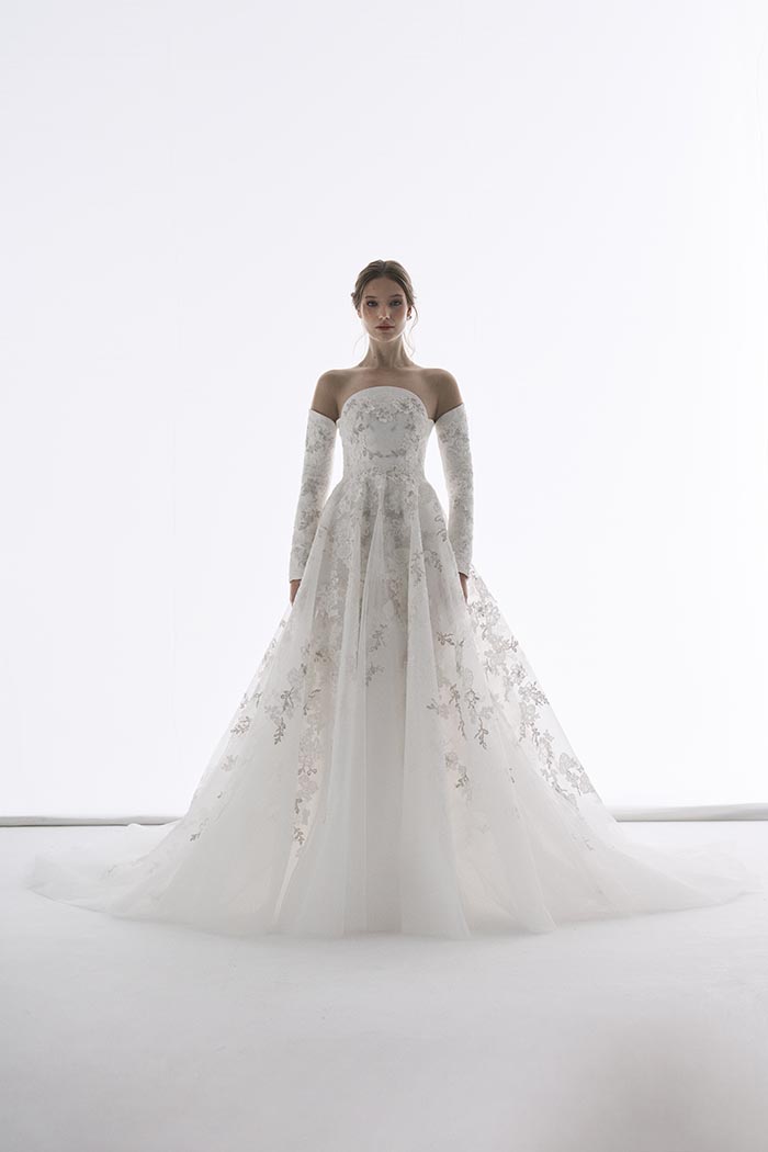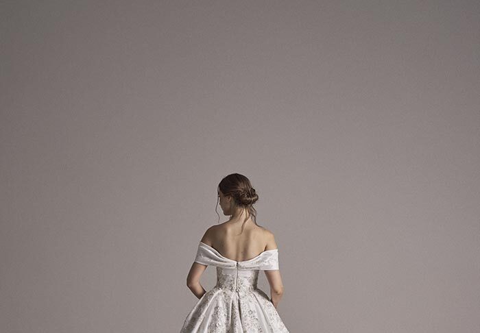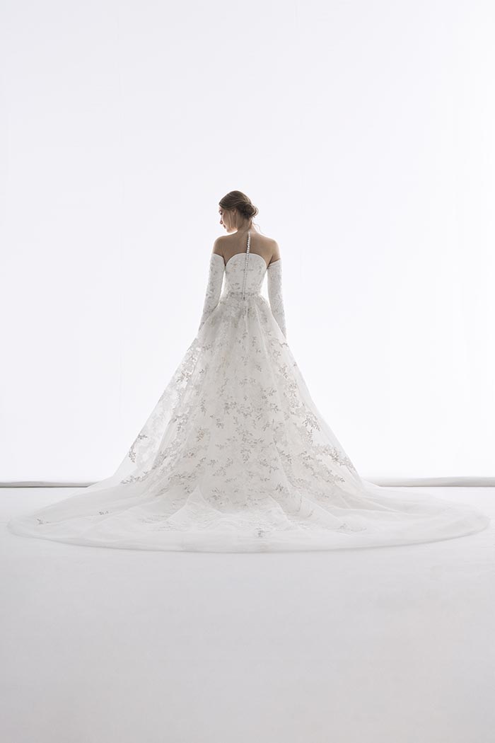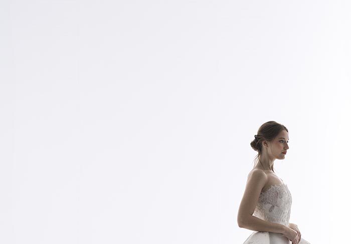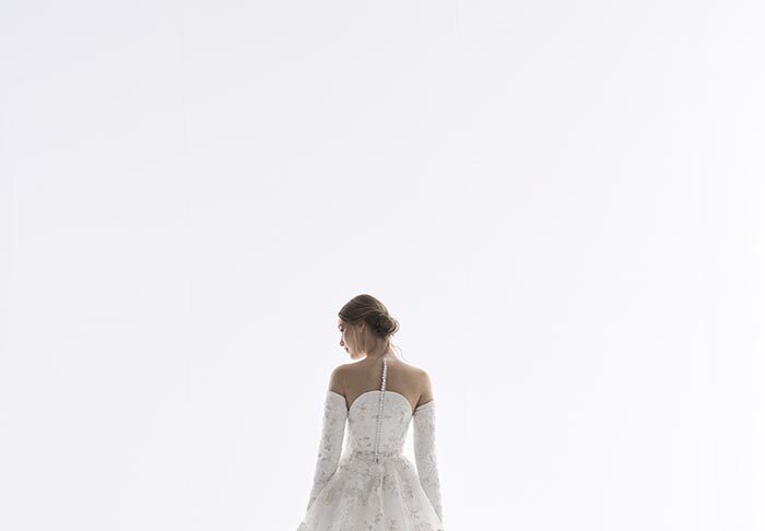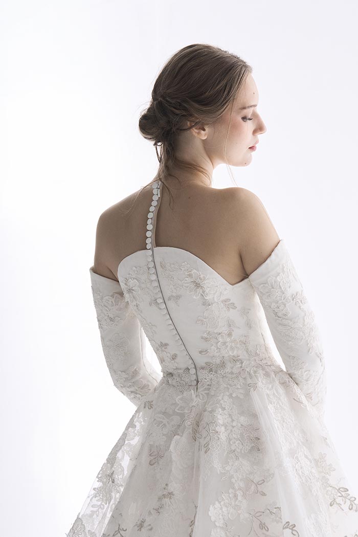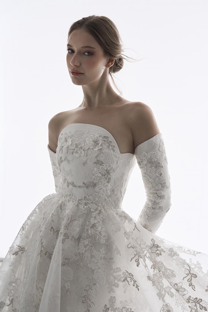 Silhouettes range from fitted bodices with defined waistlines to voluminous skirts with controlled structure. Modular design details—necklines, sleeves, and train variations—allow for personalization across classic and contemporary bridal aesthetics.