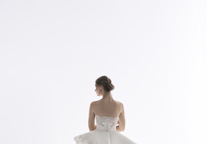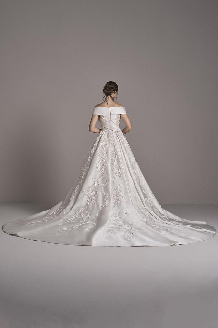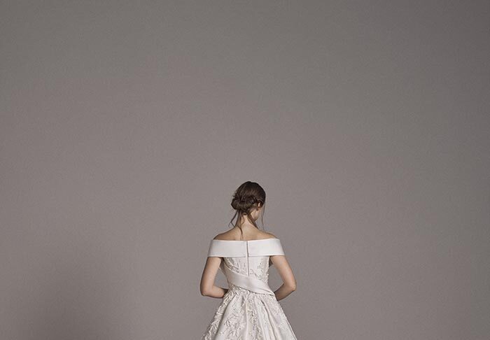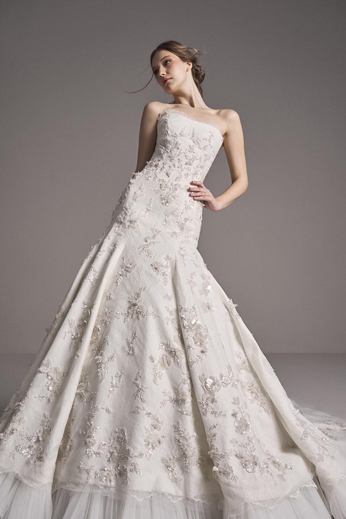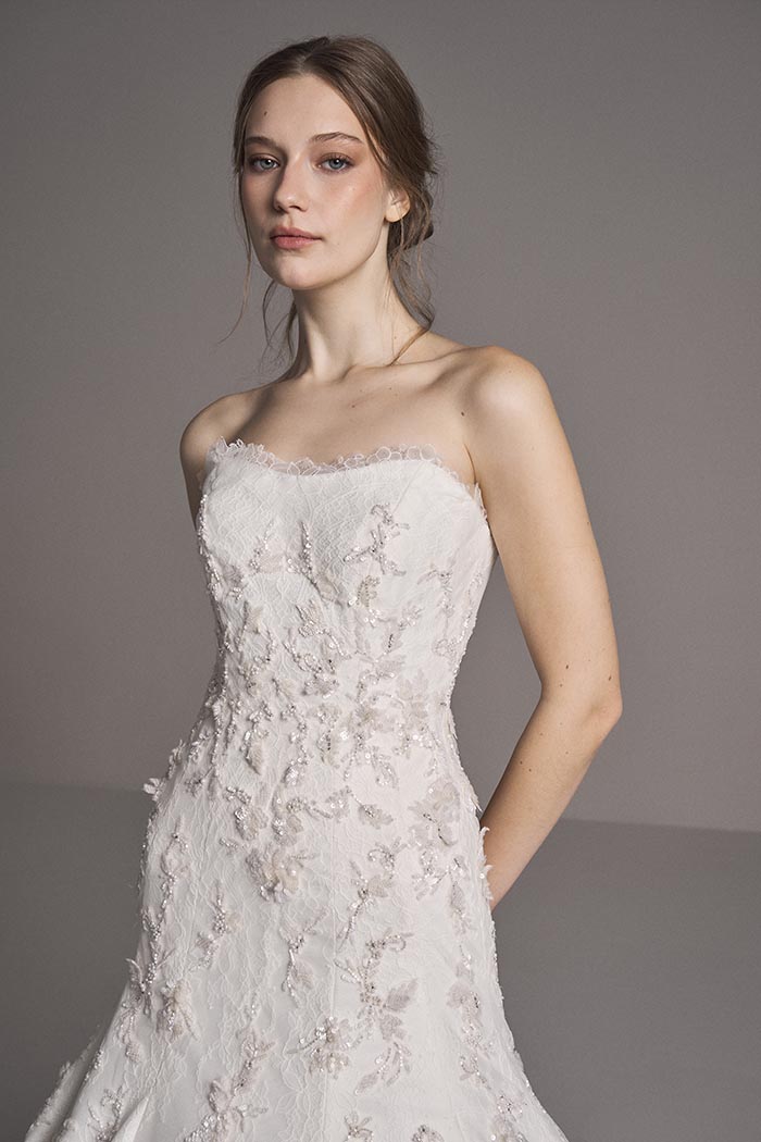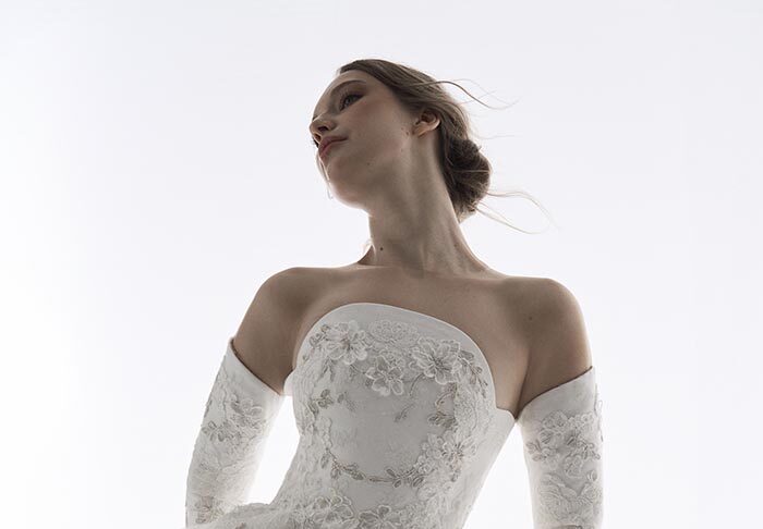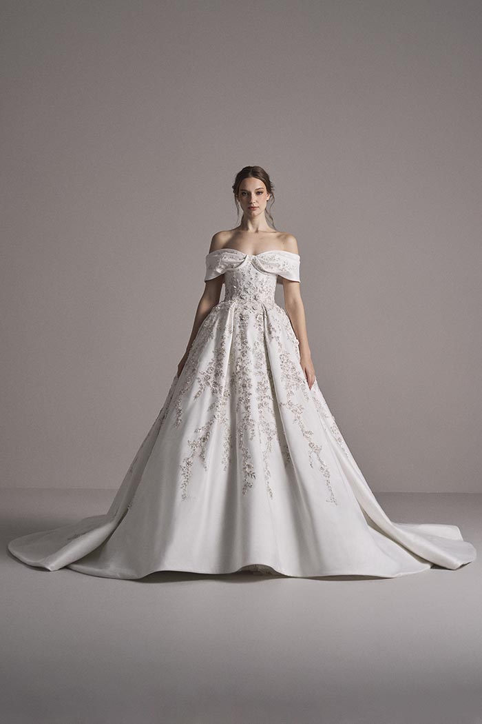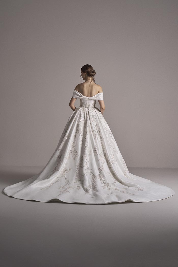 Silhouettes range from fitted bodices with defined waistlines to voluminous skirts with controlled structure. Modular design details—necklines, sleeves, and train variations—allow for personalization across classic and contemporary bridal aesthetics.
