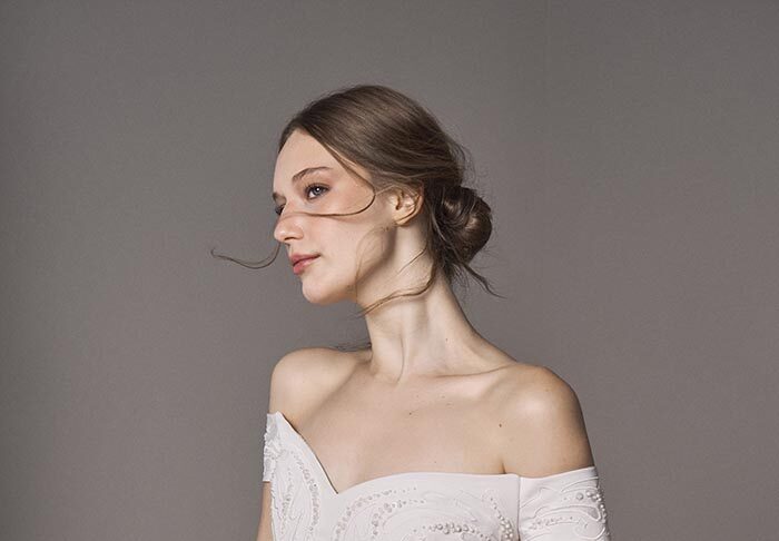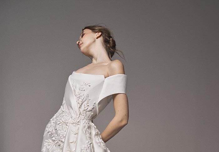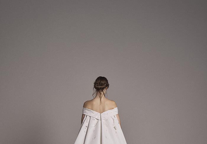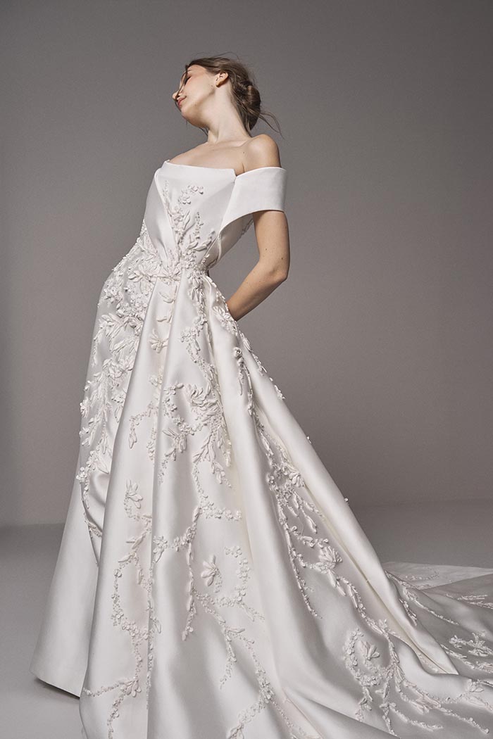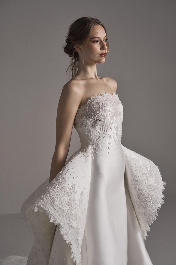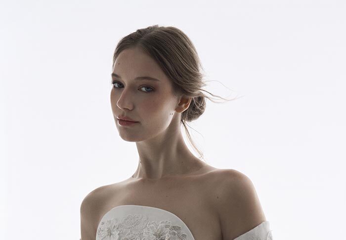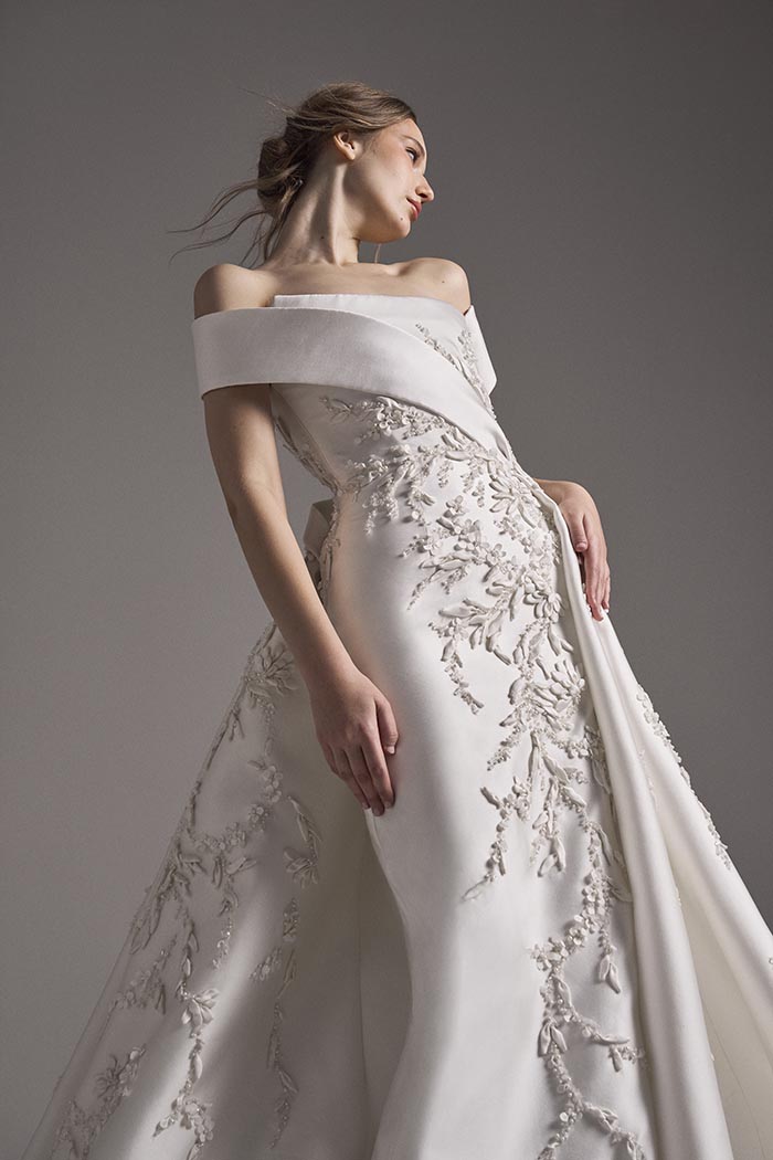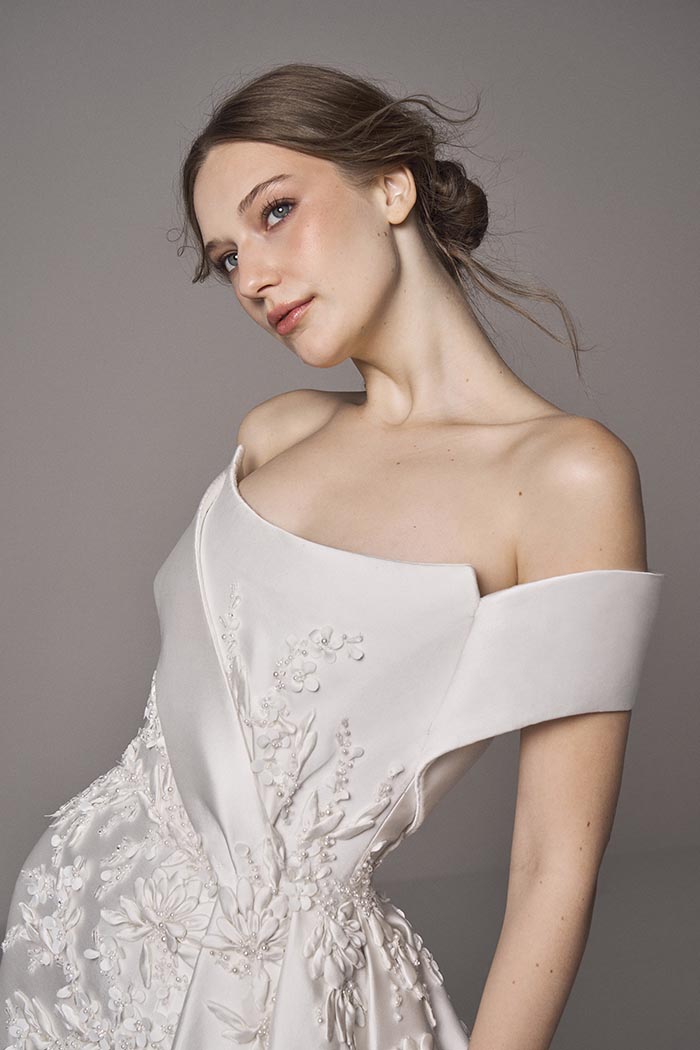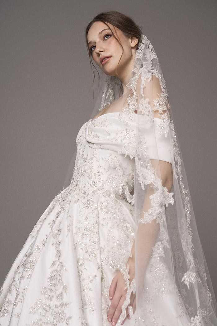 The collection works with a focused selection of fabrics: Mikado satin for structure, silk tulle for transparency and weightlessness, and fine lace for intricate surface detail. Embroidery references floral and baroque motifs, executed with hand beading, thread work, and applique—applied to enhance depth and texture without overwhelming the lines of each dress.