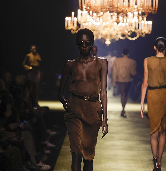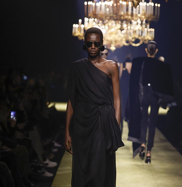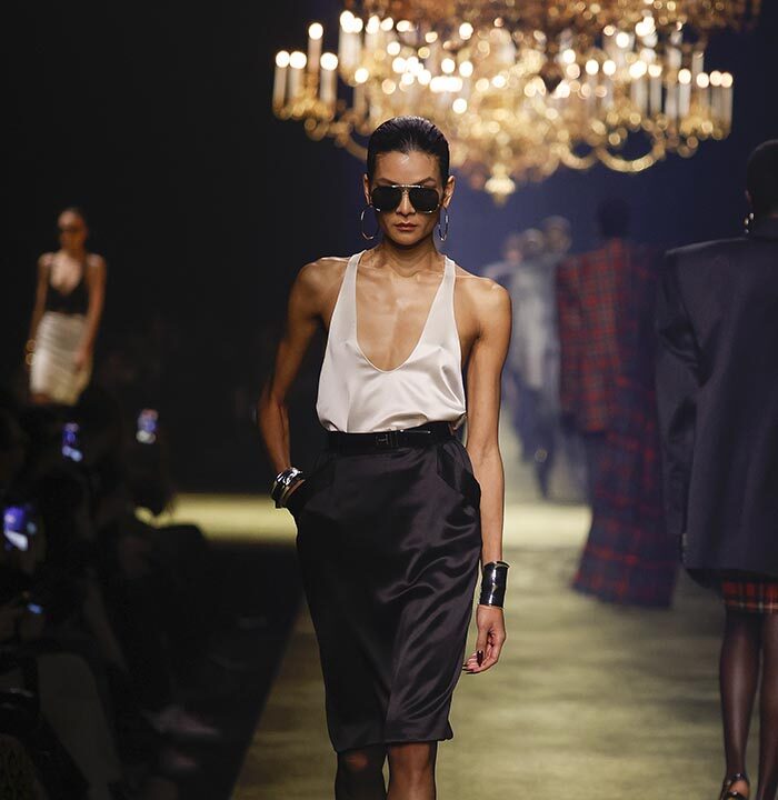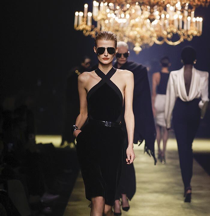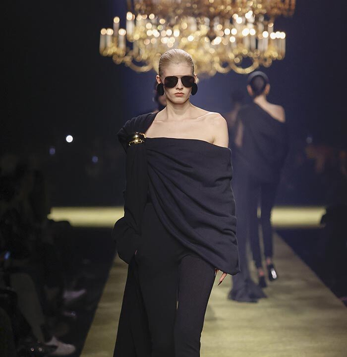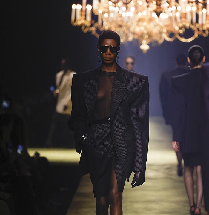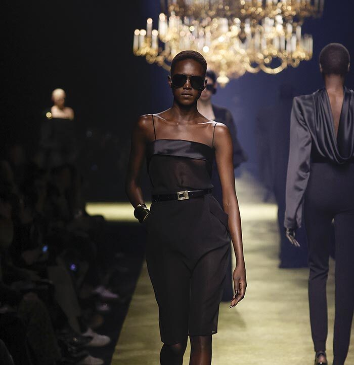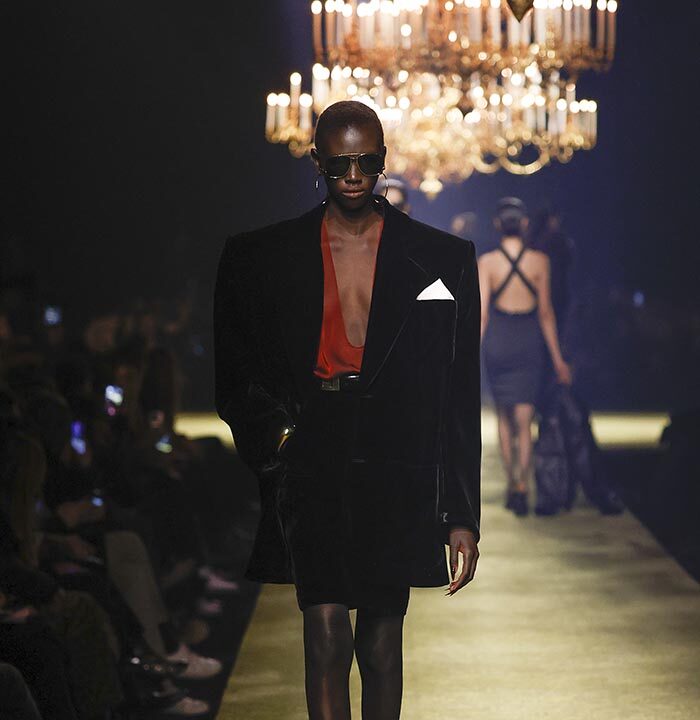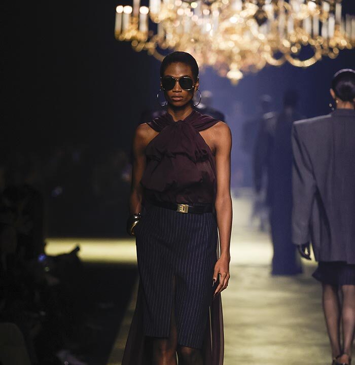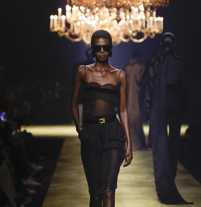 The venue is inspired by the ballroom of the Intercontinental Hotel, where the brand presented all its Haute Couture collections between 1975 and 2001. Making the reference newly relevant, Vaccarello has taken the symbols of that opulent period – striking bronze chandeliers and a uniquely shaped runway – and inserted them into a radically contemporary black-box setting.
