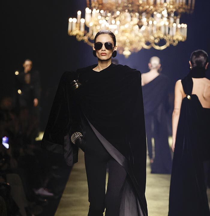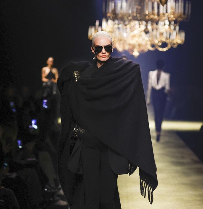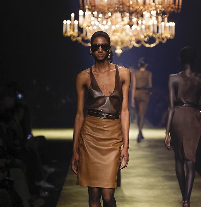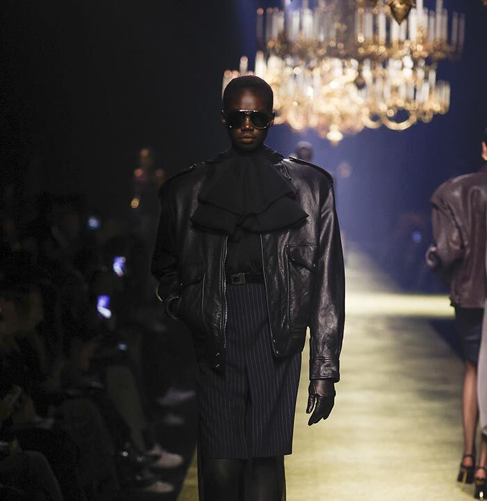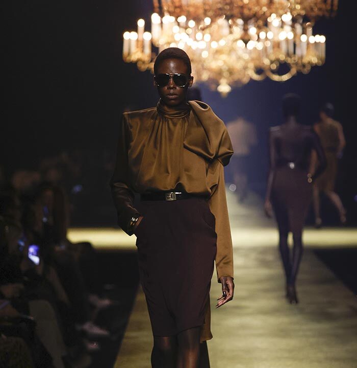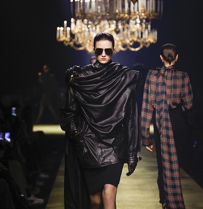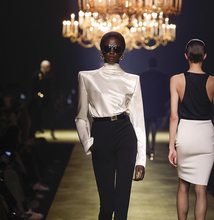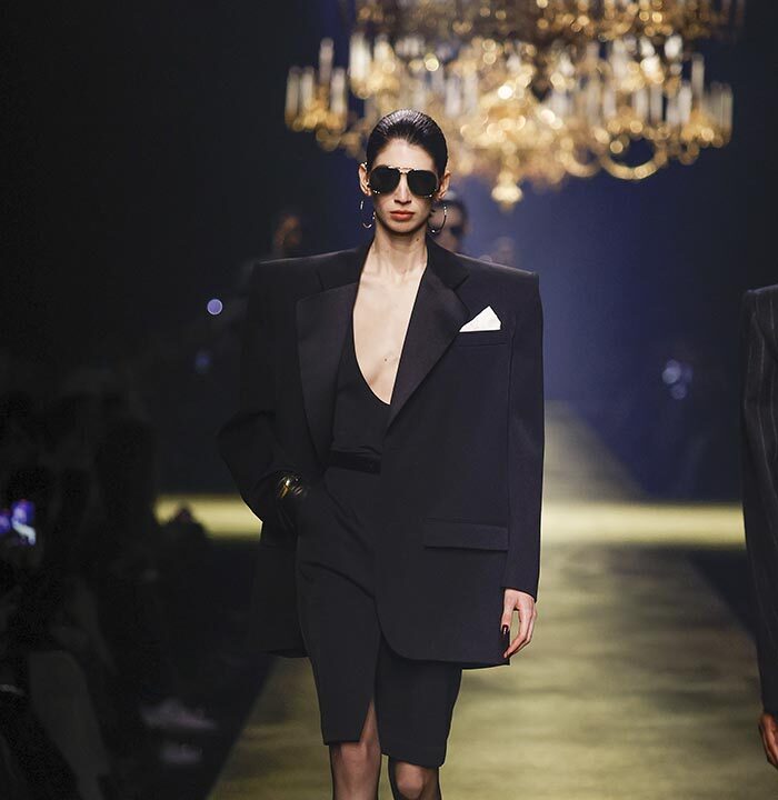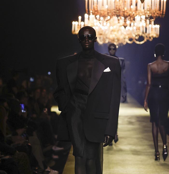 The venue is inspired by the ballroom of the Intercontinental Hotel, where the brand presented all its Haute Couture collections between 1975 and 2001. Making the reference newly relevant, Vaccarello has taken the symbols of that opulent period – striking bronze chandeliers and a uniquely shaped runway – and inserted them into a radically contemporary black-box setting.