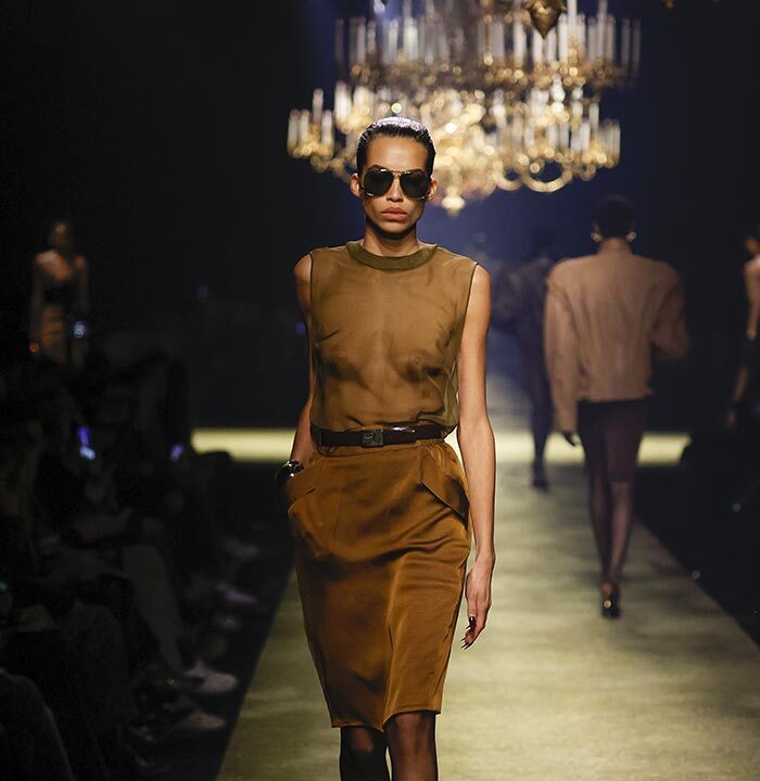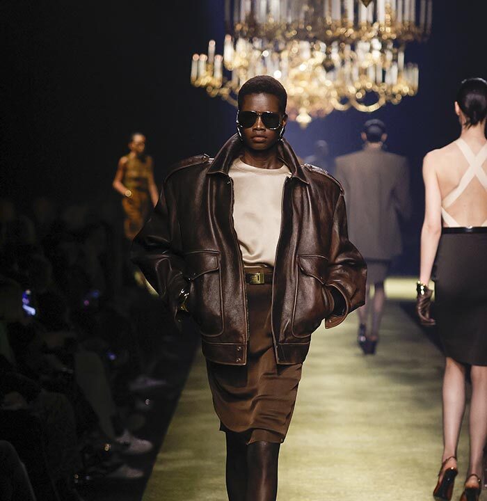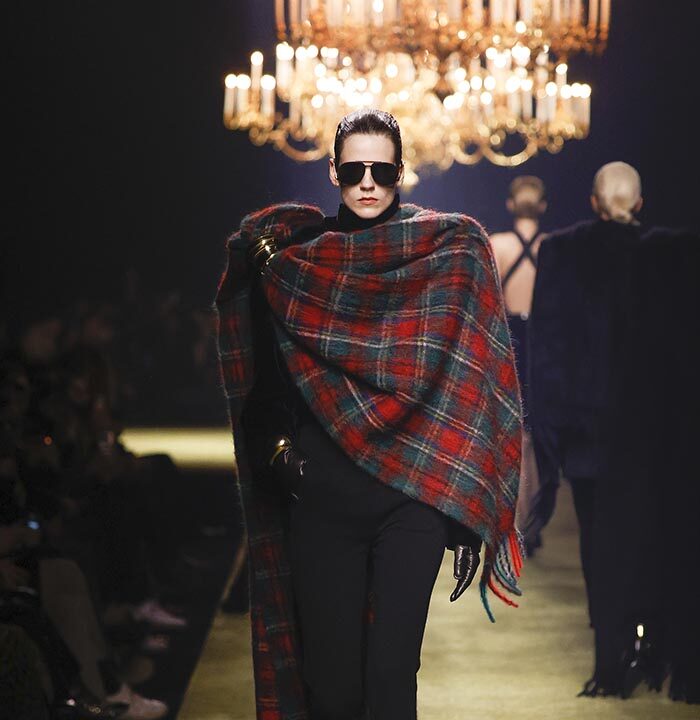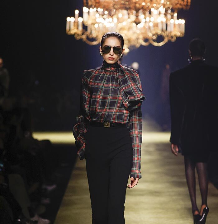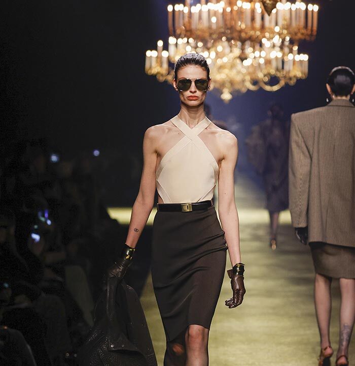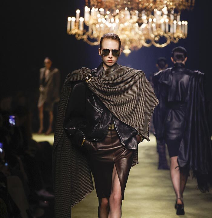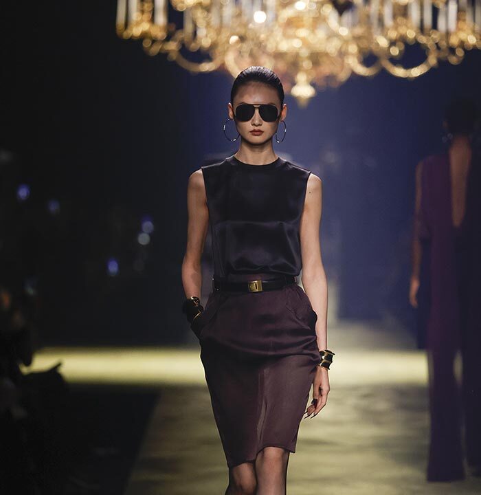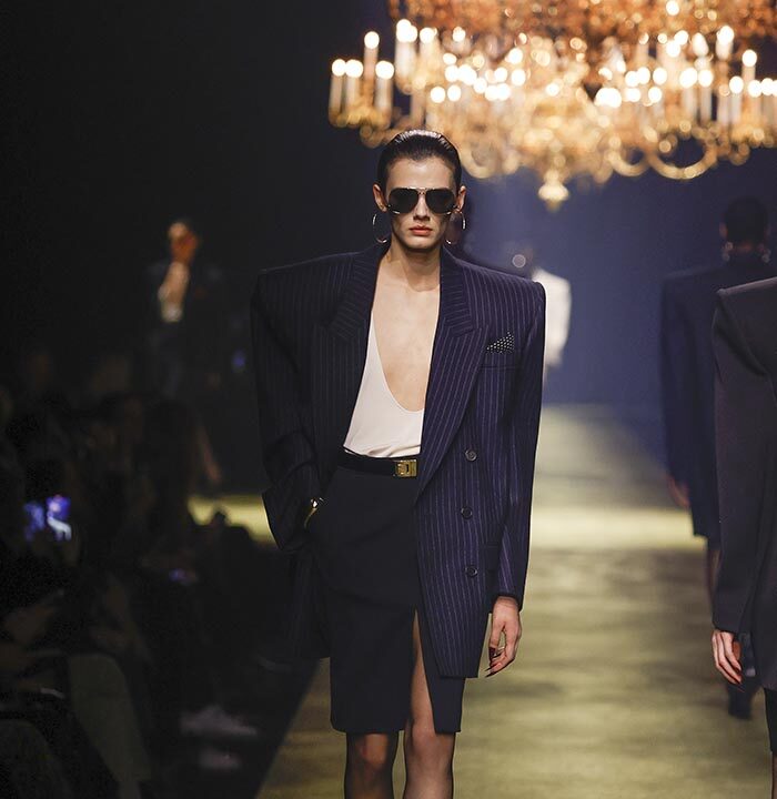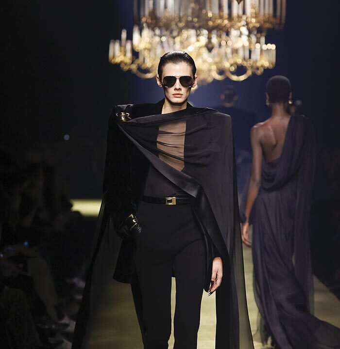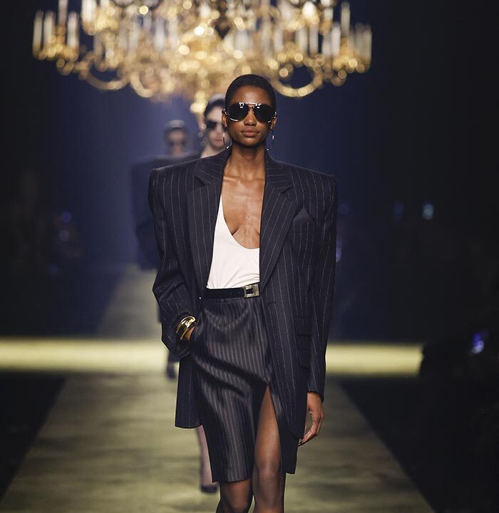 The venue is inspired by the ballroom of the Intercontinental Hotel, where the brand presented all its Haute Couture collections between 1975 and 2001. Making the reference newly relevant, Vaccarello has taken the symbols of that opulent period – striking bronze chandeliers and a uniquely shaped runway – and inserted them into a radically contemporary black-box setting.