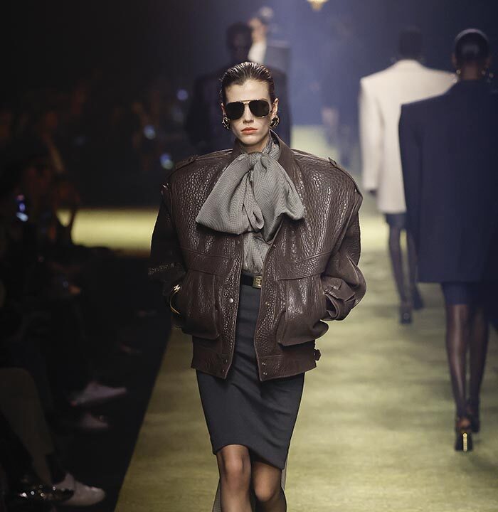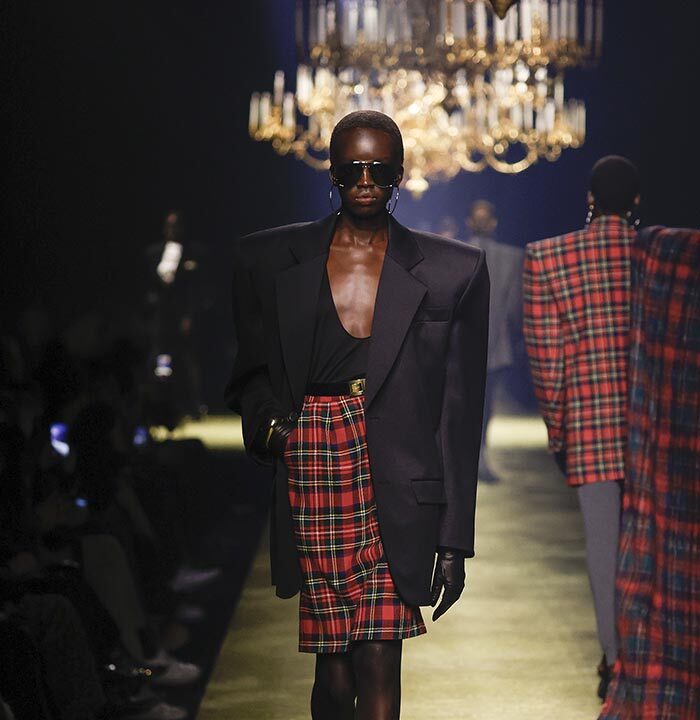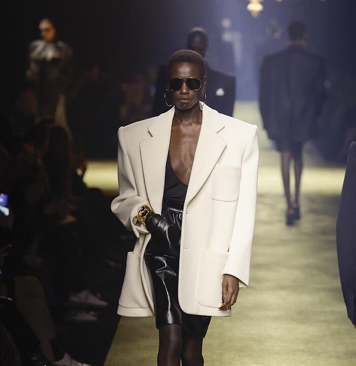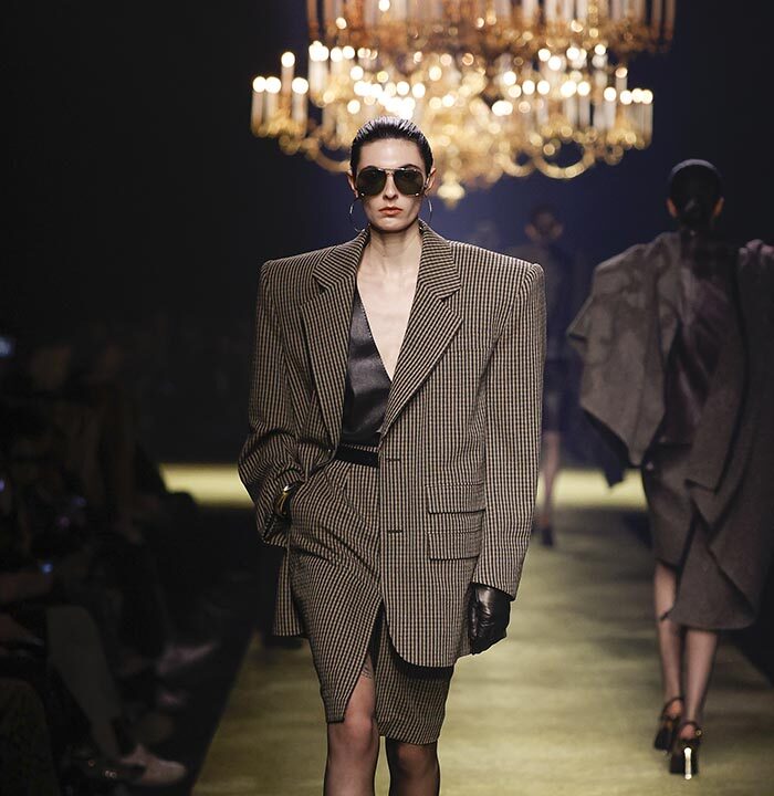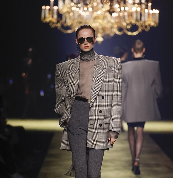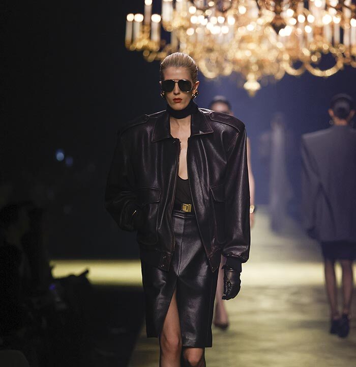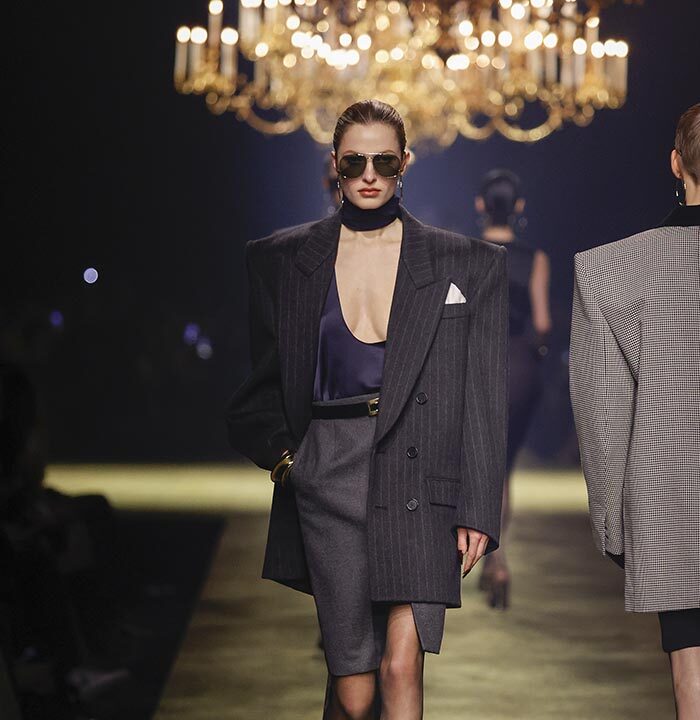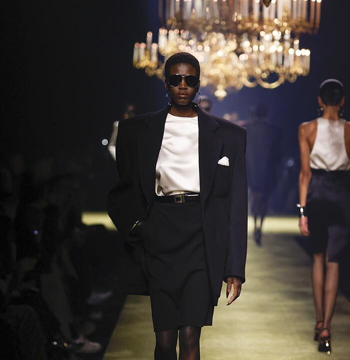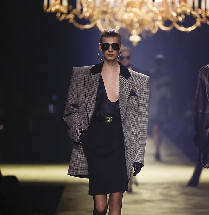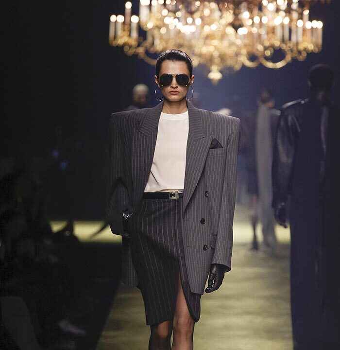 In lieu of choosing a specific embodiment of the Saint Laurent woman, for the house’s winter 2023 collection, Anthony Vaccarello distilled the essence of classic Saint Laurent style – a potent mix of precision, emotion and reticence – and combined it with his own codes for a severely reconfigured take, reflective of the current moment, on a familiar aesthetic : the tailleur-jupe.