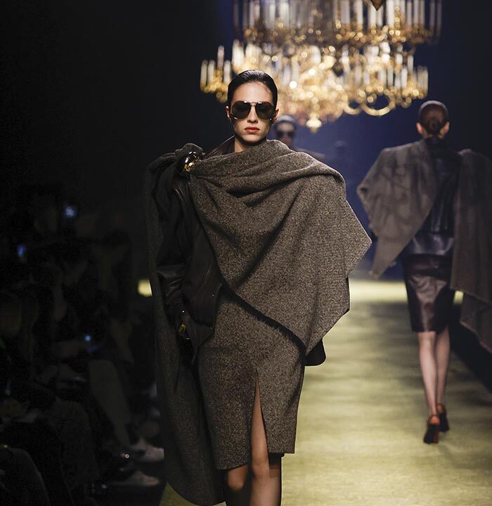The precision can be found in the sharp shoulder line of a bold new blazer. It all starts with this gesture, fabric dictates the rest. Creating enticing friction, the structured jacket is juxtaposed with a flowing layer of cloth, a signature scarf that may merge with the bow of a blouse or extend down like a stole.