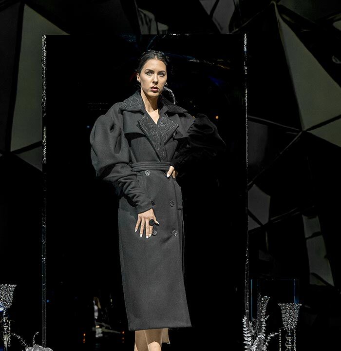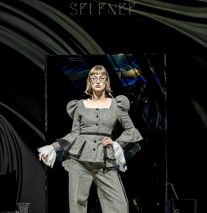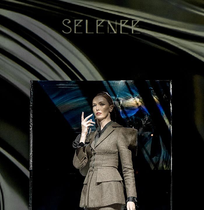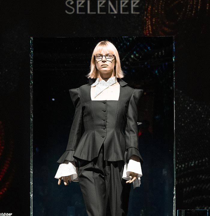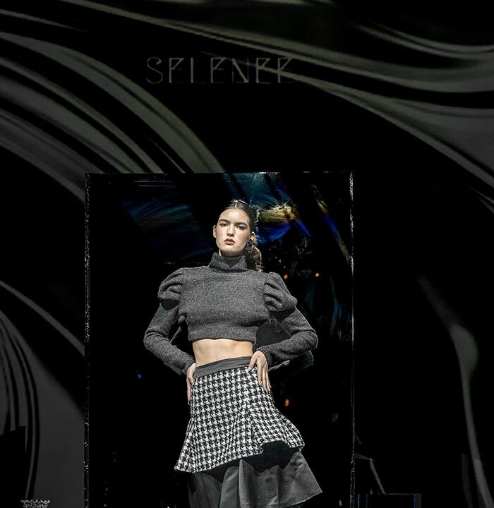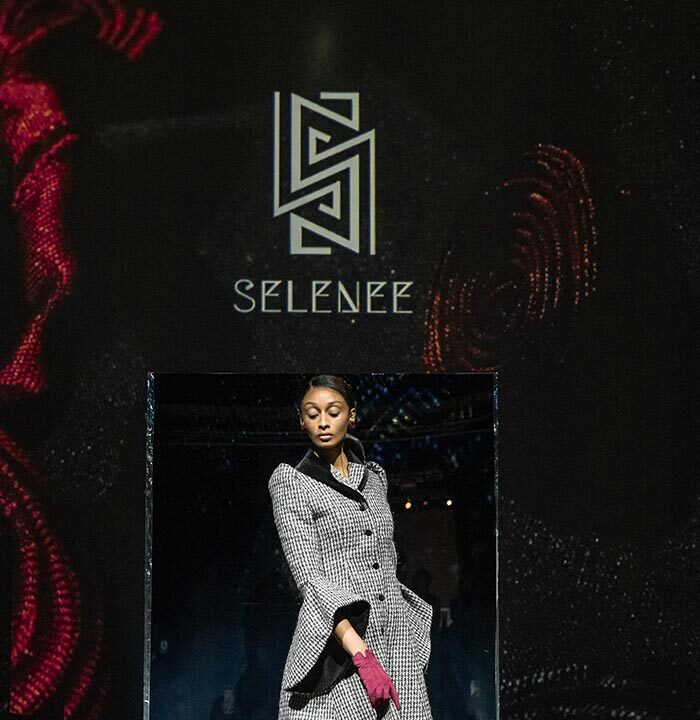 From classic plaid wool to flowing fabrics, SELENEE utilized a classic gray and black palette with the combination of sharp lines and flowing curves that capture the mysterious essence of a labyrinth. A collision of vintage and modern sensibilities is evident through plaid fabrics meeting three-dimensional tailoring, reflecting the theme of time intertwining. Corseted coats, exaggerated shoulders, suit dresses, checkered pants, wool blousons, and leather sweatshirts, capes and dresses defined this season’s collection. Pieces are available for purchase on the SELENEE website and range from $480.00 to $5,800.