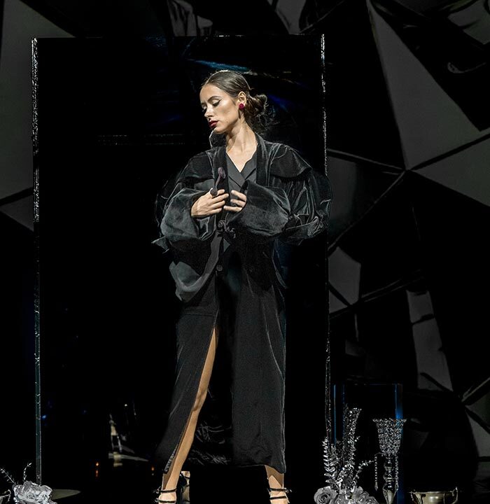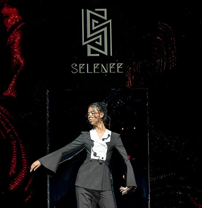 Guests previewed the debut collection on the runway, savored cocktails, all while enjoying a crowd-cheering presentation as a curation of glamourous models walked a mysterious garden of mirrors, stopping at each area of enchantment for a posed reveal! A total of 36 looks were showcased, beginning with influencer and model Sonya Esman and culminating in a grand finale featuring a red ruffled bow gown by the designer MT Yang.