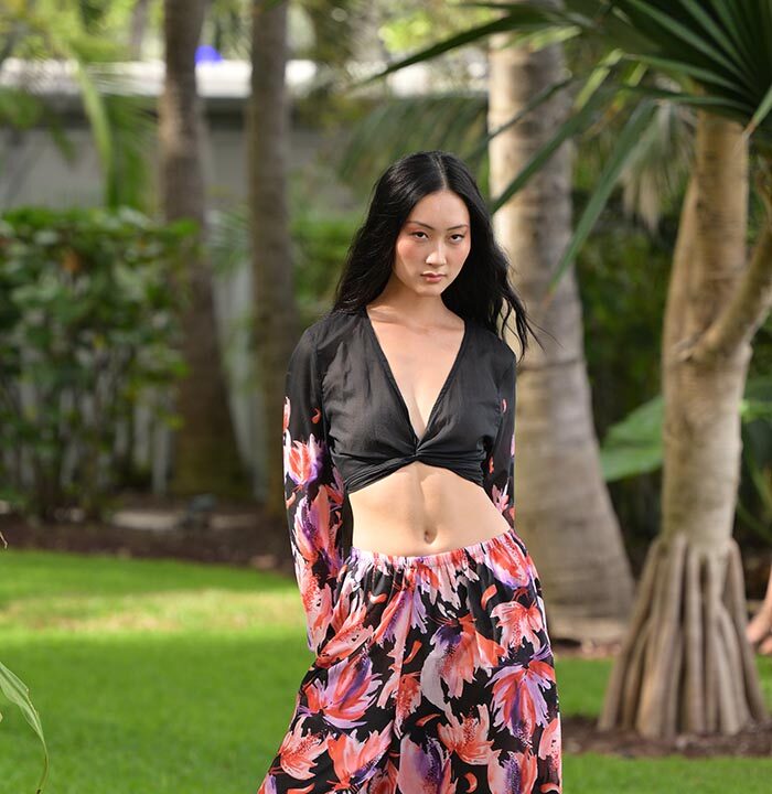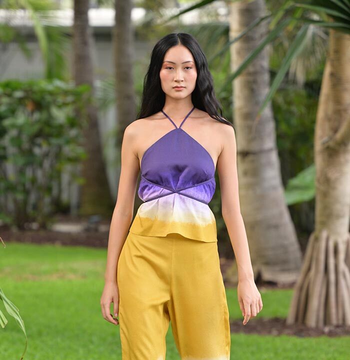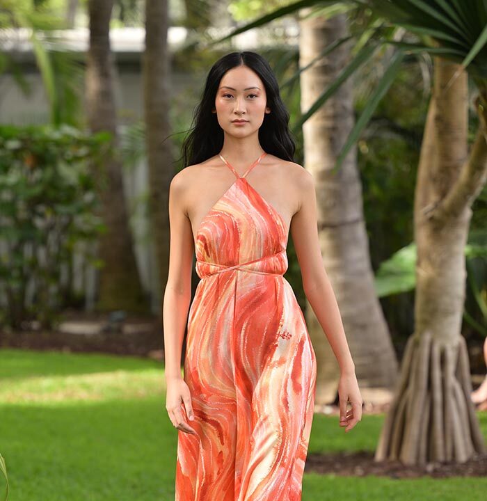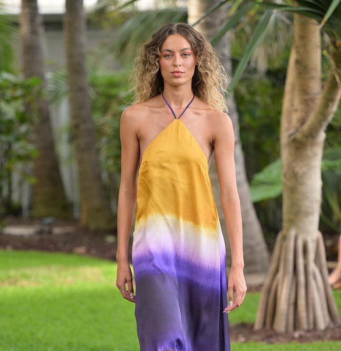 Flowing kaftans, breezy sets, and sculptural swimwear graced the runway, crafted from organic fiber textiles and hand-painted in hues inspired by terracotta sands, blooming cacti, and sun-dried chiles. Standout fabrics included cotton/linen, cotton voile, viscose, Tencel and recycled Poly/spandex, each serving as a canvas for Sigal’s original watercolor paintings created in her Miami studio.