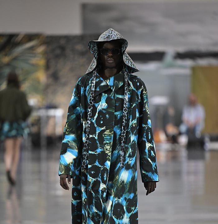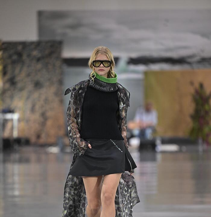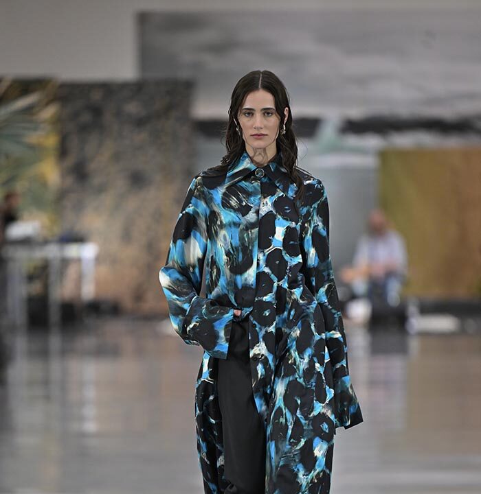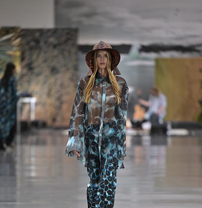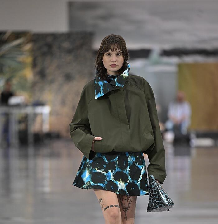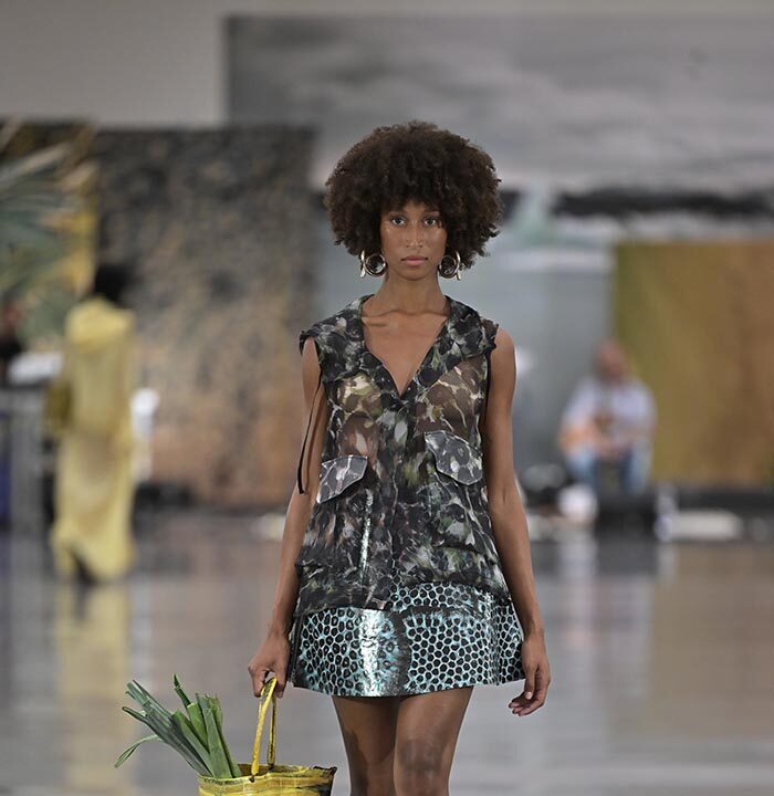 Her label stands out for its bold approach to material innovation, transforming recycled gardening objects into refined and unexpected accessories and clothes. This creative process not only breathes new life into existing resources but also allows her to develop exclusive prints, forging a strong and instantly recognizable visual identity.