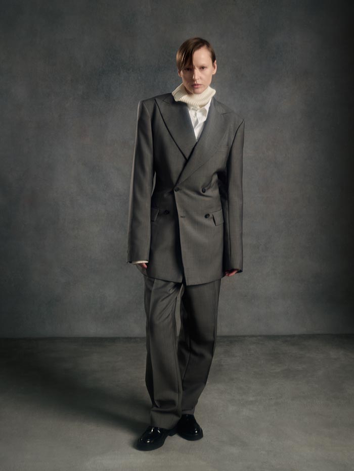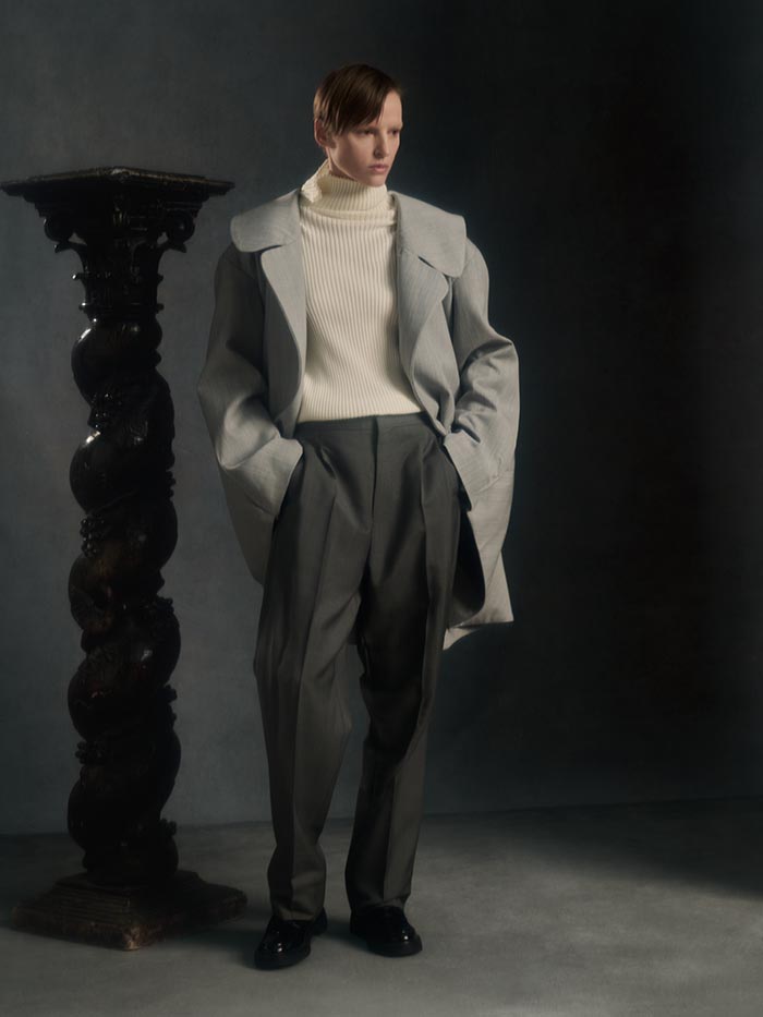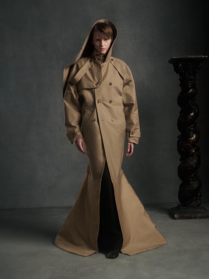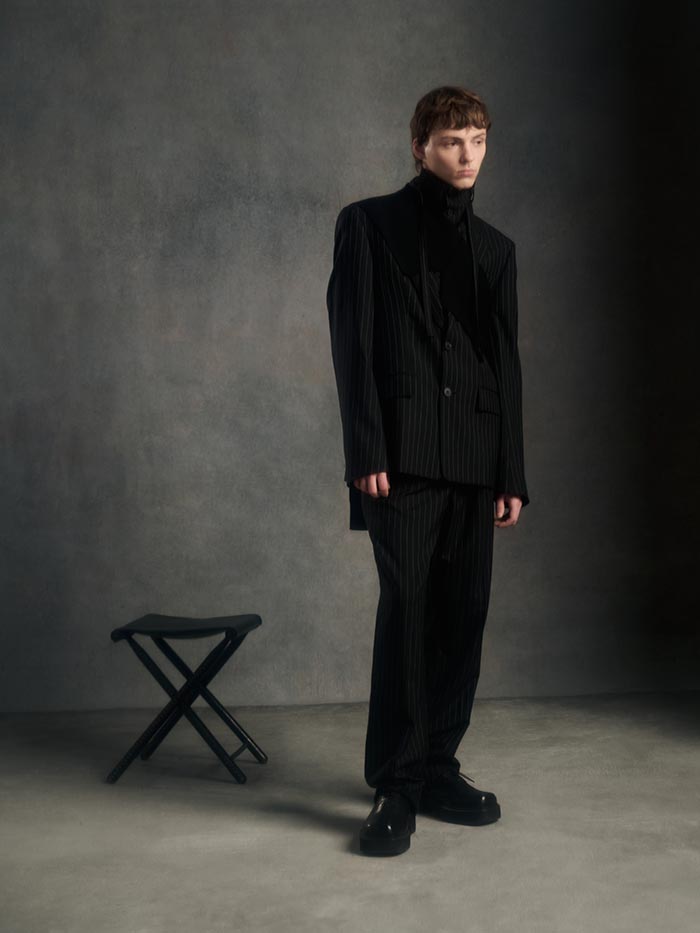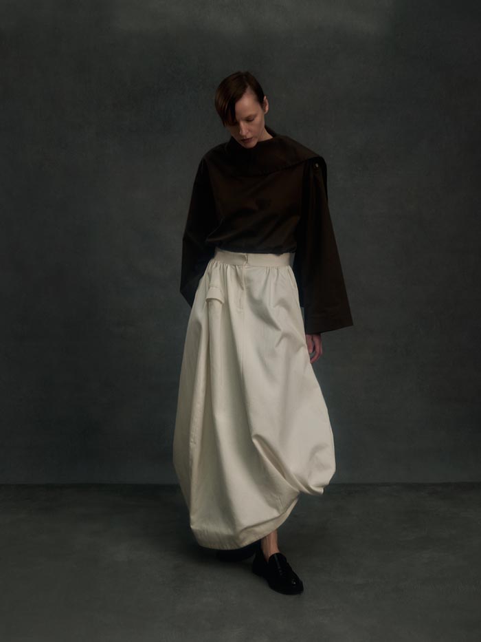Volumes expand and drift away from the body, suspended between structure and air. Tailoring loosens its hold, opening into fluid constructions where garments appear in motion even at rest. Pieces overlap, collide, and shift, caught in a moment of transition.