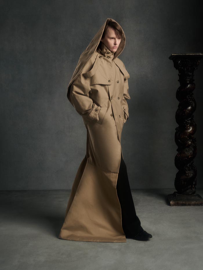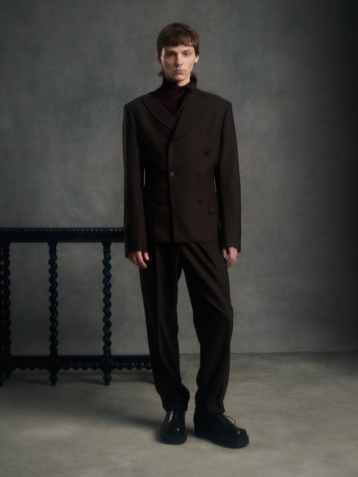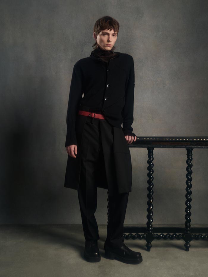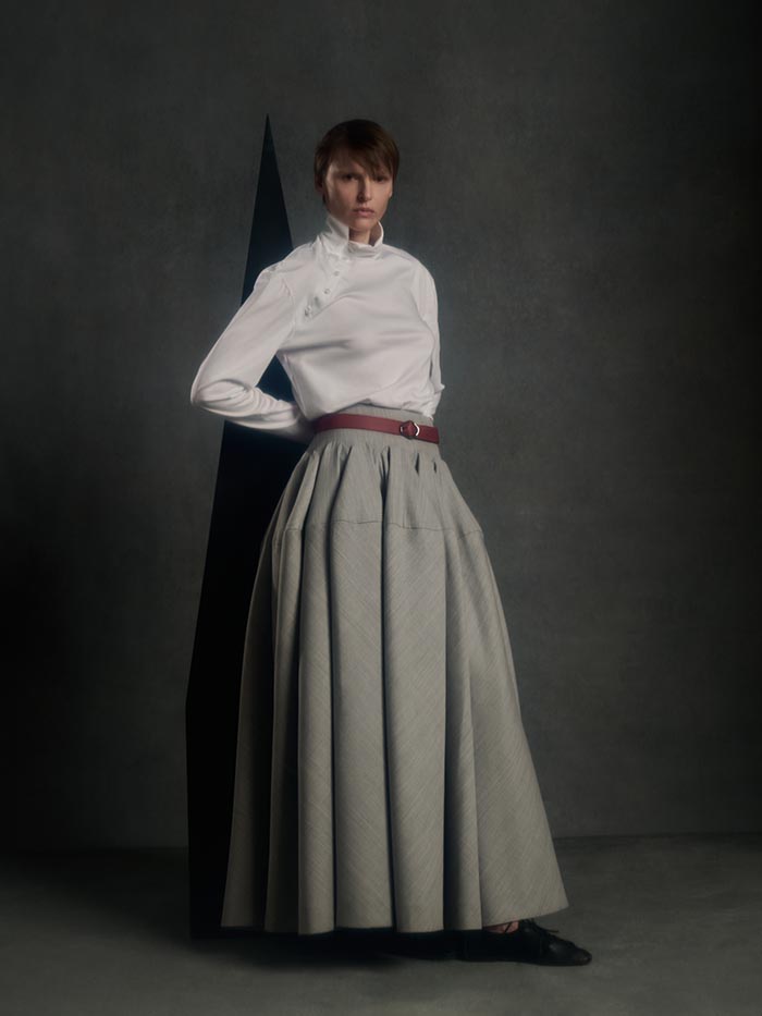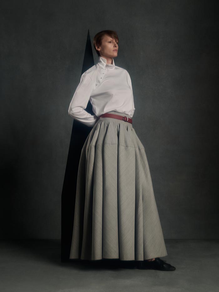 Volumes expand and drift away from the body, suspended between structure and air. Tailoring loosens its hold, opening into fluid constructions where garments appear in motion even at rest. Pieces overlap, collide, and shift, caught in a moment of transition.