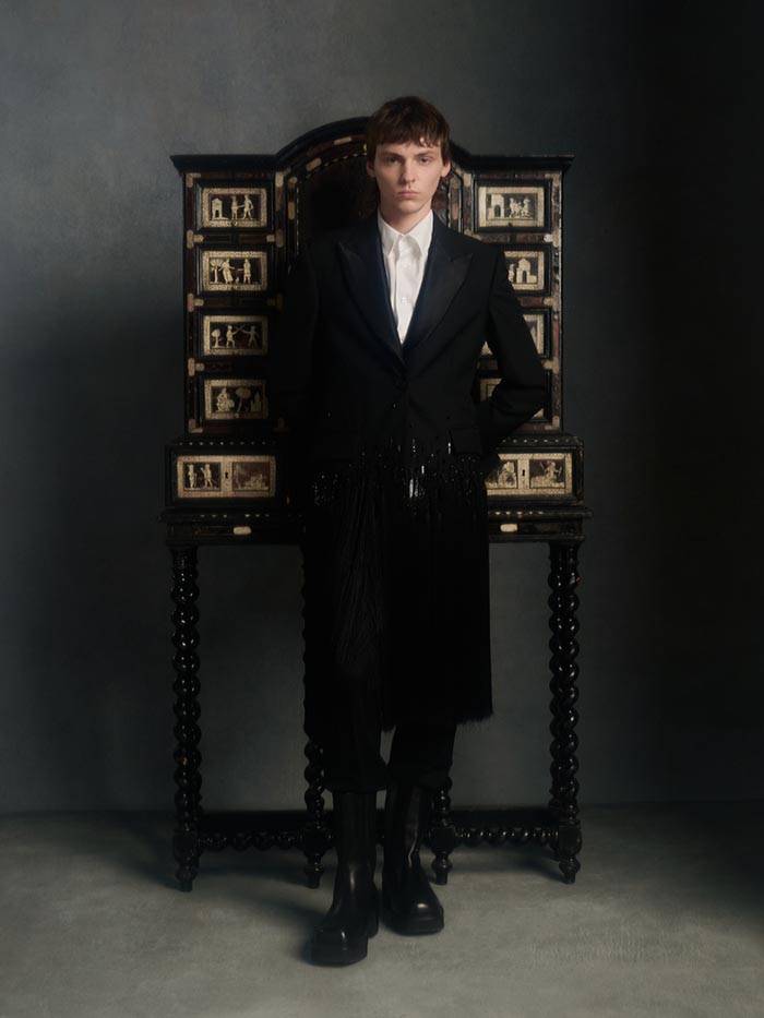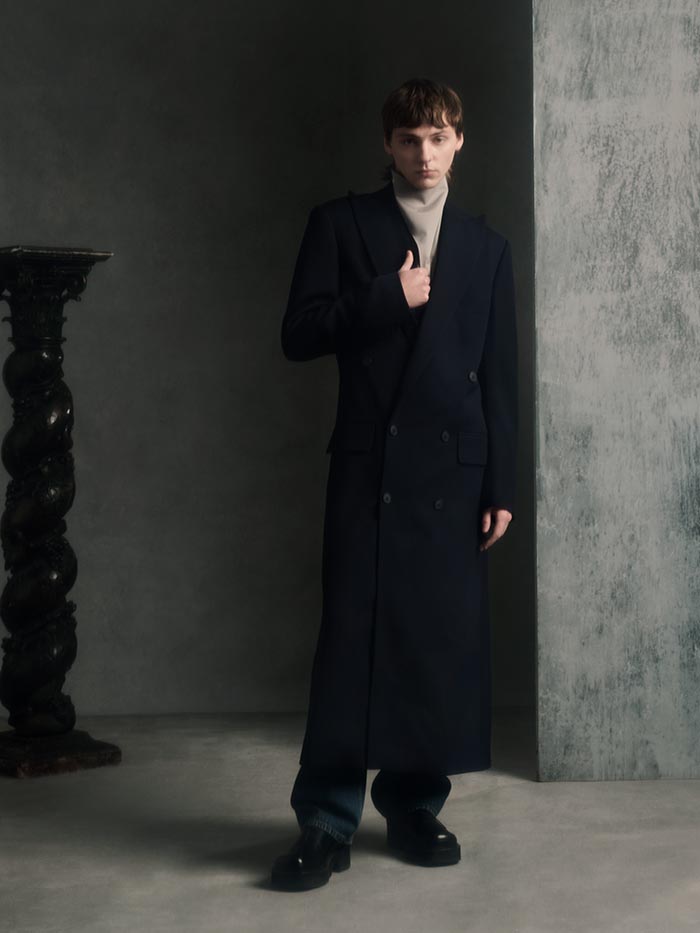 Tailored lapels rise high, as if reaching upward, a physical attempt to connect with something beyond the self.
