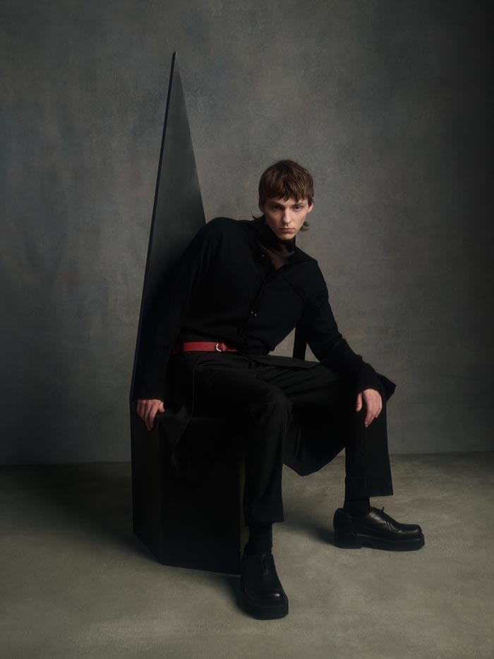Materials are approached as living elements. Soft wools, flowing textiles, and structured fabrics exist in subtle tension. Shiny leather meets fluid viscose, balancing resistance and surrender. Through movement and layering, fabrics reveal their presence, allowing texture, light, and gesture to define the silhouette.