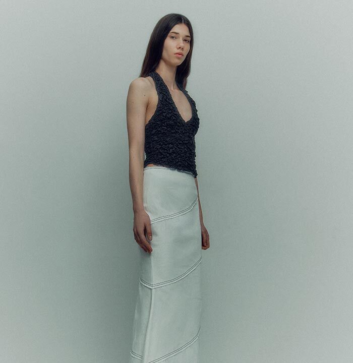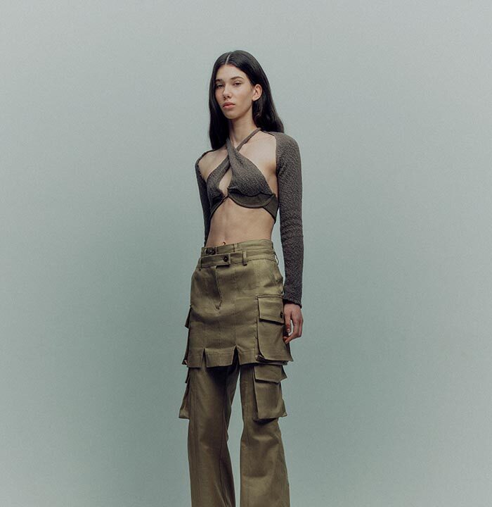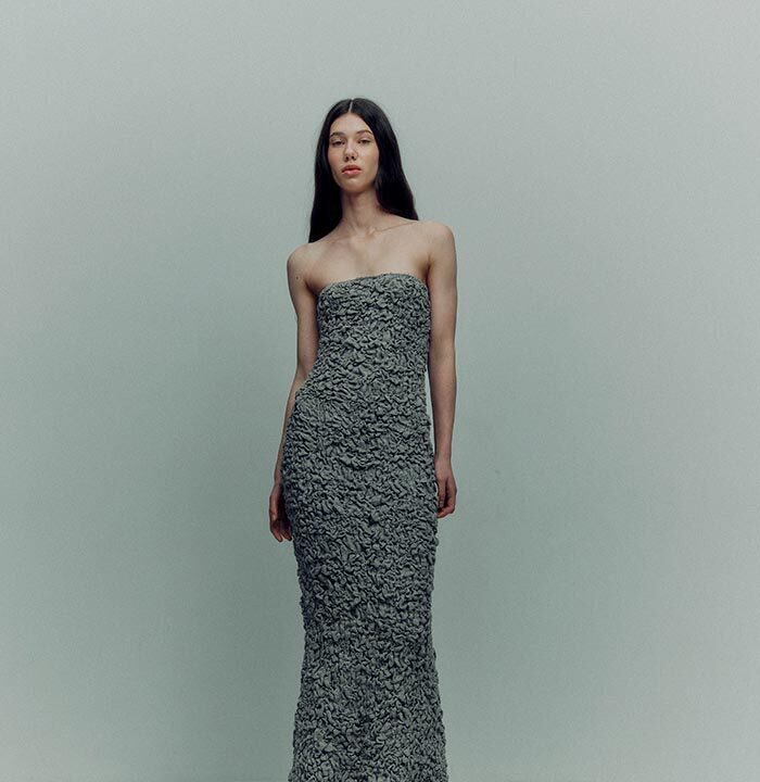 The collection consists of easy-to-wear separates, textured knits, bustier dresses, and more. The color palette is neutral with an emphasis on earthy hues — khaki, graphite, volcanic gray — and a bright splash of light green.